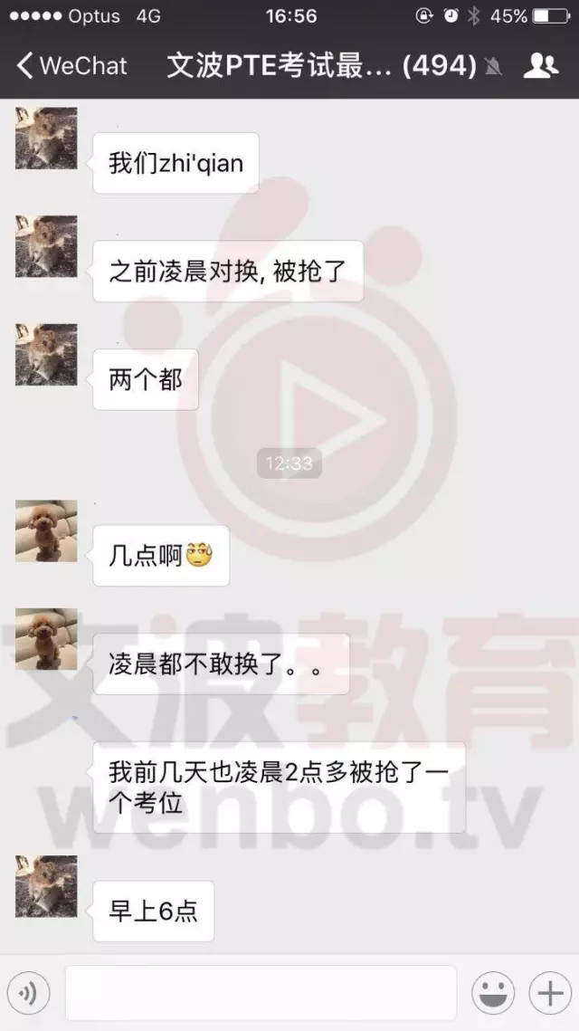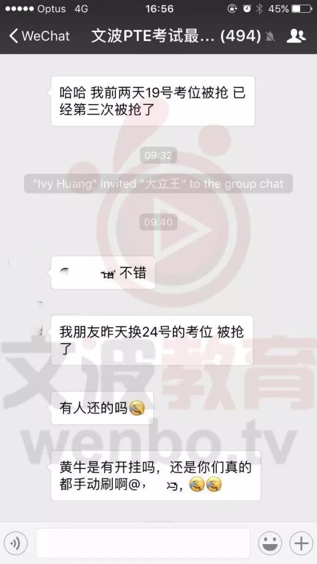 因为换考位的盛行,也催生了另外一个职业——PTE报名黄牛。黄牛们手上要么有考位,要么可以帮你刷到考位。早期的黄牛们靠的是吃苦耐劳的精神,手动一直刷新,碰到刚刚有同学退考或者Pearson临时放出一些考位,就立马帮同学们占住。但黄牛也是人,也要休息,不可能24小时守在电脑面前,而同学们换考位确实会随时发生的。于是,黄牛们也开始运用科技的力量,用软件来占考位。目前墨尔本悉尼文波PTE真题分享群里每天都有同学抱怨考位又被抢了,各个时间段都有。我们也截了几张图,让大家直观感受一下。