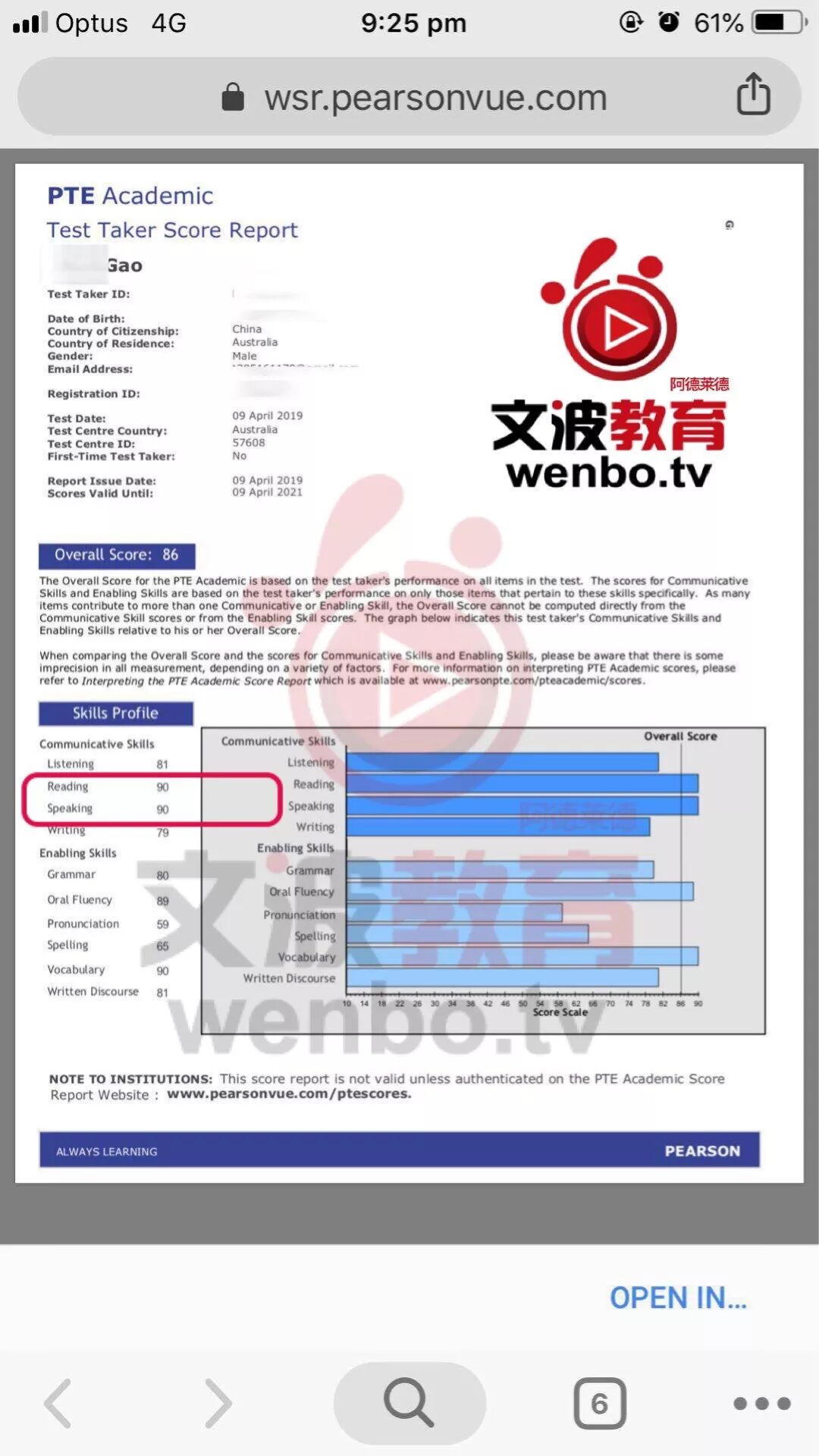 恭喜墨尔本悉尼霍巴特阿德莱德文波PTE学员Greg获得听力81,阅读90,口语90,写作79,总分86的好成绩!