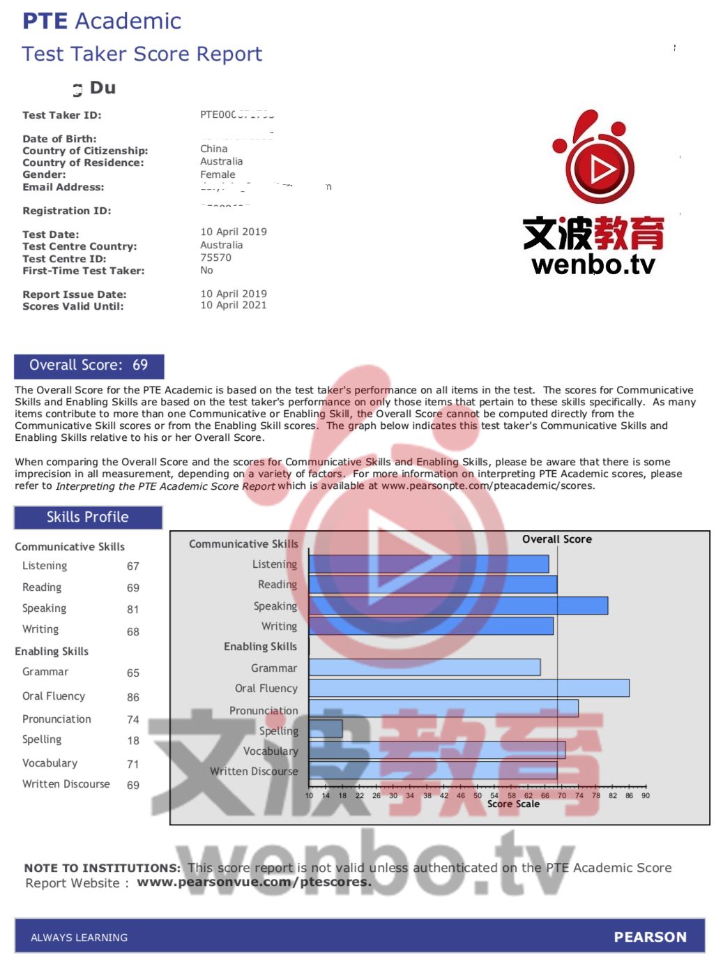 恭喜墨尔本悉尼霍巴特阿德莱德文波PTE学员Du获得听力67,阅读69,口语81,写作68,总分69的好成绩!