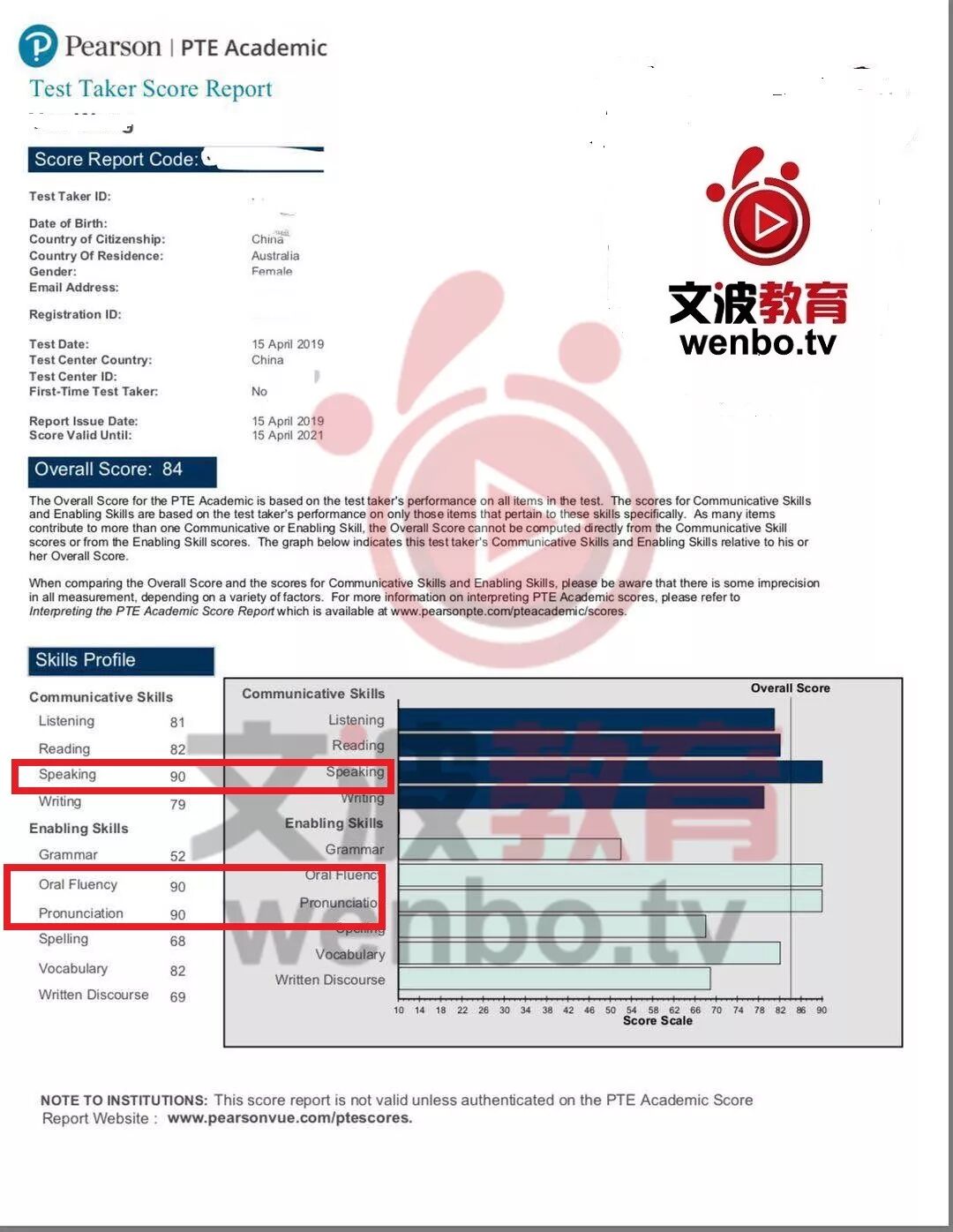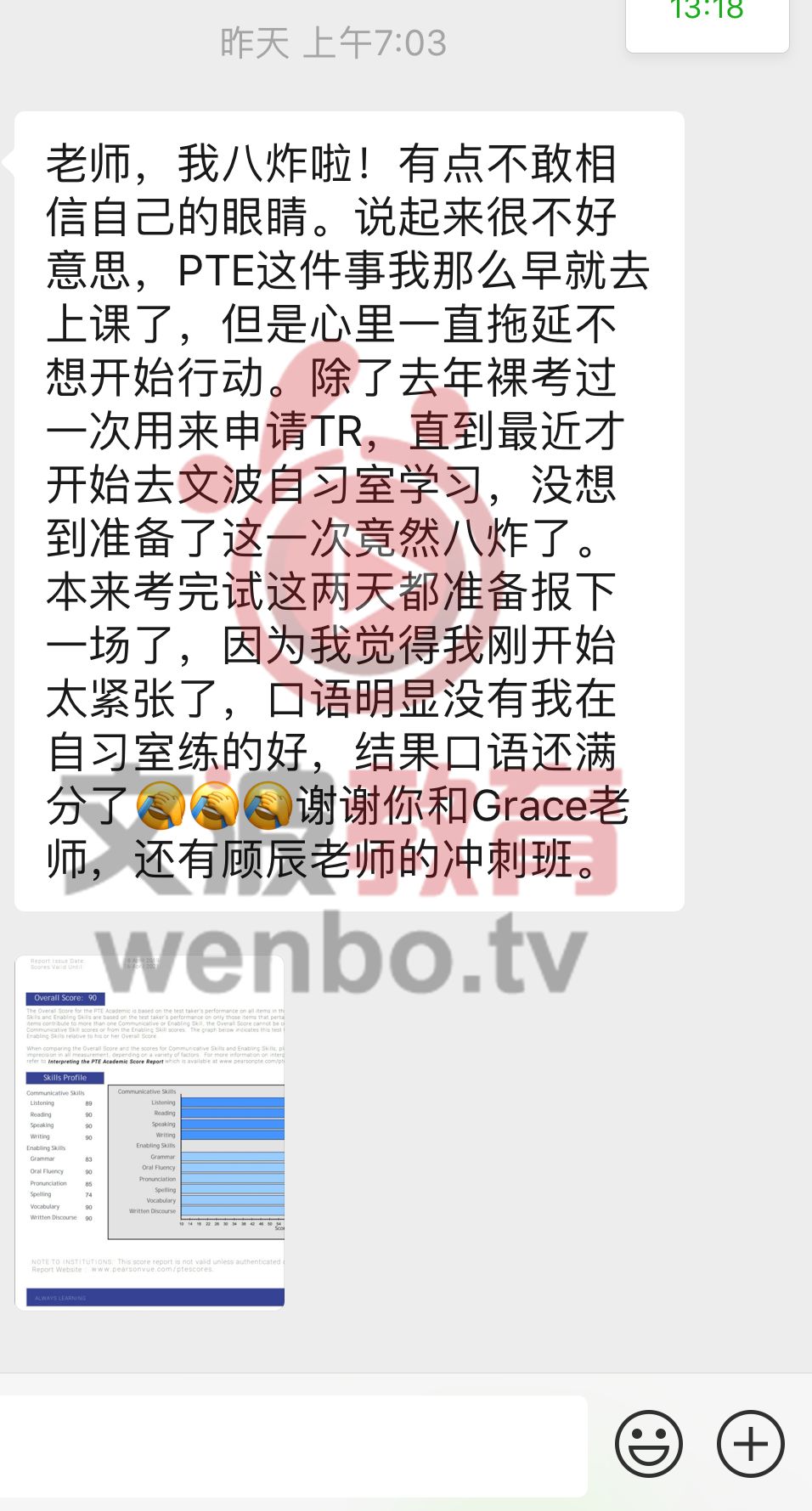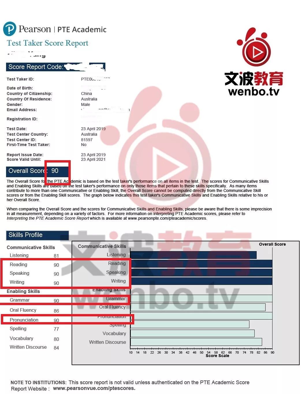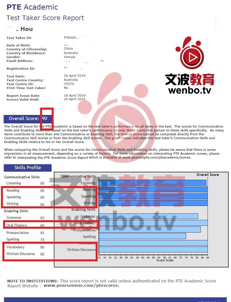 恭喜墨尔本悉尼霍巴特阿德莱德文波PTE学员Hou获得听力89,阅读90,口语90,写作90,总分90的好成绩!