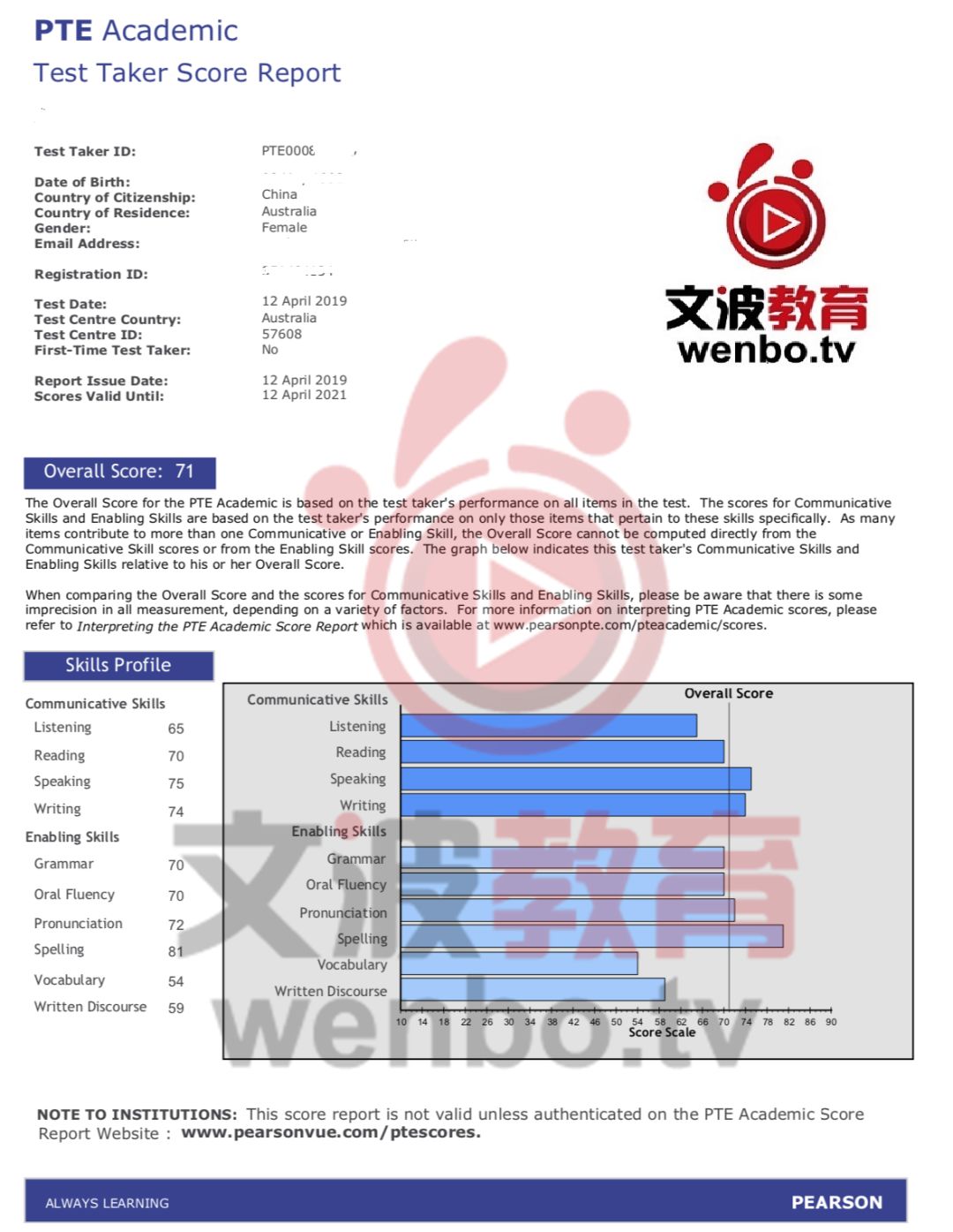 恭喜墨尔本悉尼霍巴特阿德莱德文波PTE学员J获得听力65,阅读70,口语75,写作74,总分71的好成绩!
