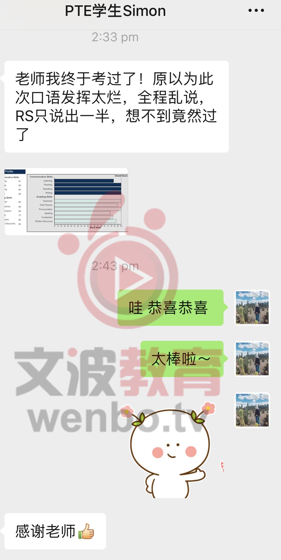 恭喜墨尔本悉尼霍巴特阿德莱德文波PTE学员Simon同学获得听力81,阅读90,口语90,写作90,总分90的好成绩!