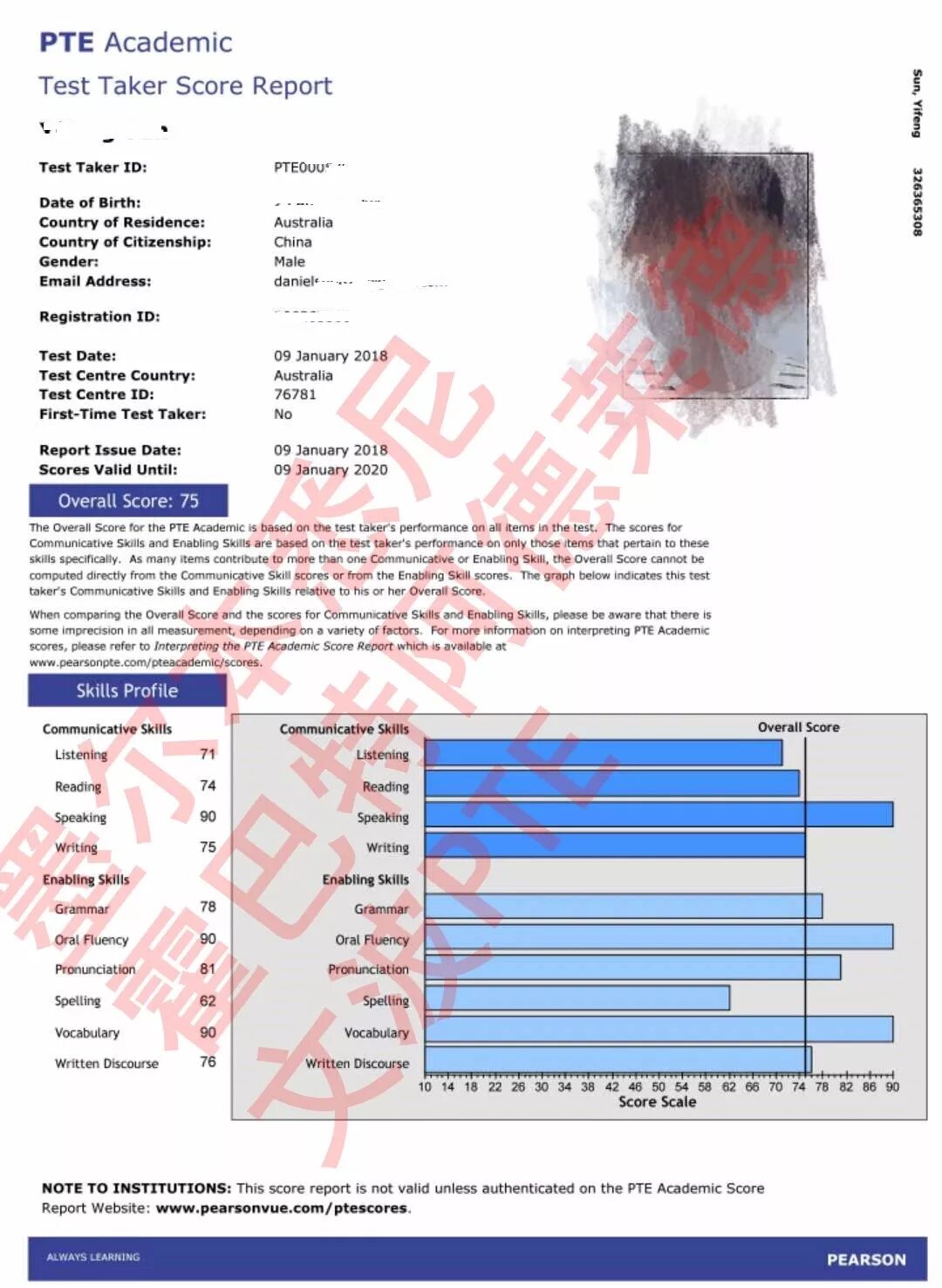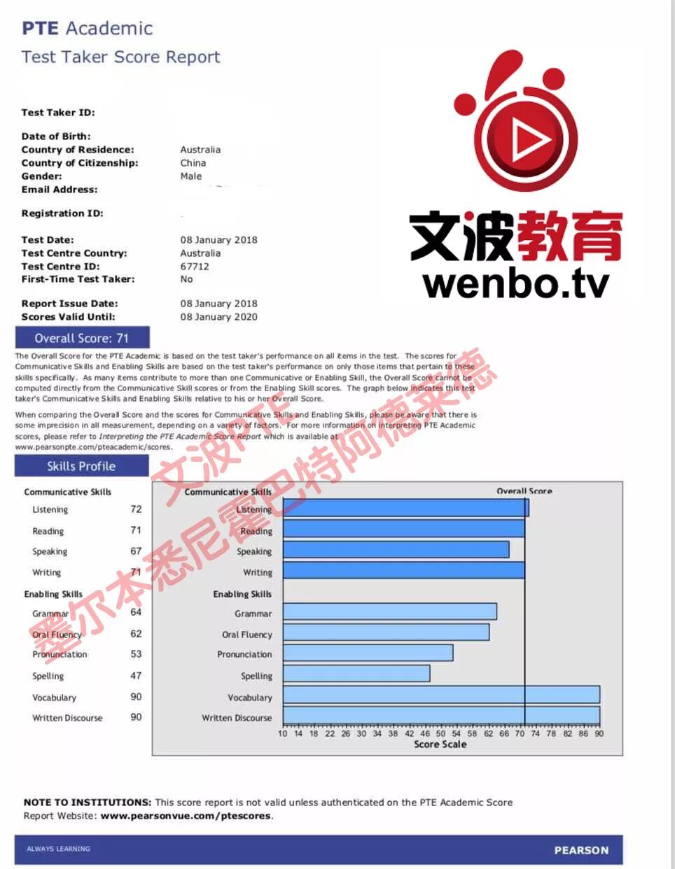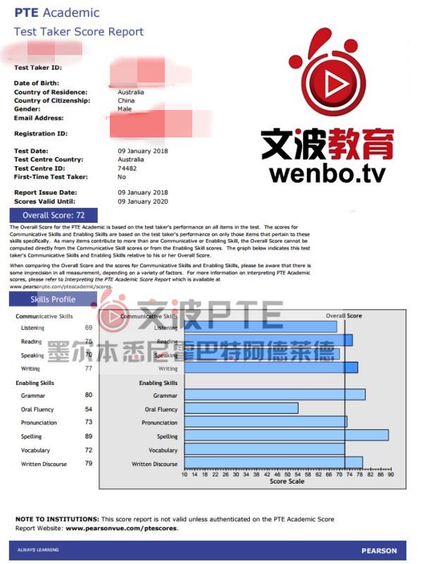 恭喜墨尔本悉尼霍巴特阿德莱德文波PTE学员Daniel同学获得听力71,阅读74,口语90,写作75,总分75分的好成绩!也是一月文波PTE第20位通过四个七四个八的学员。