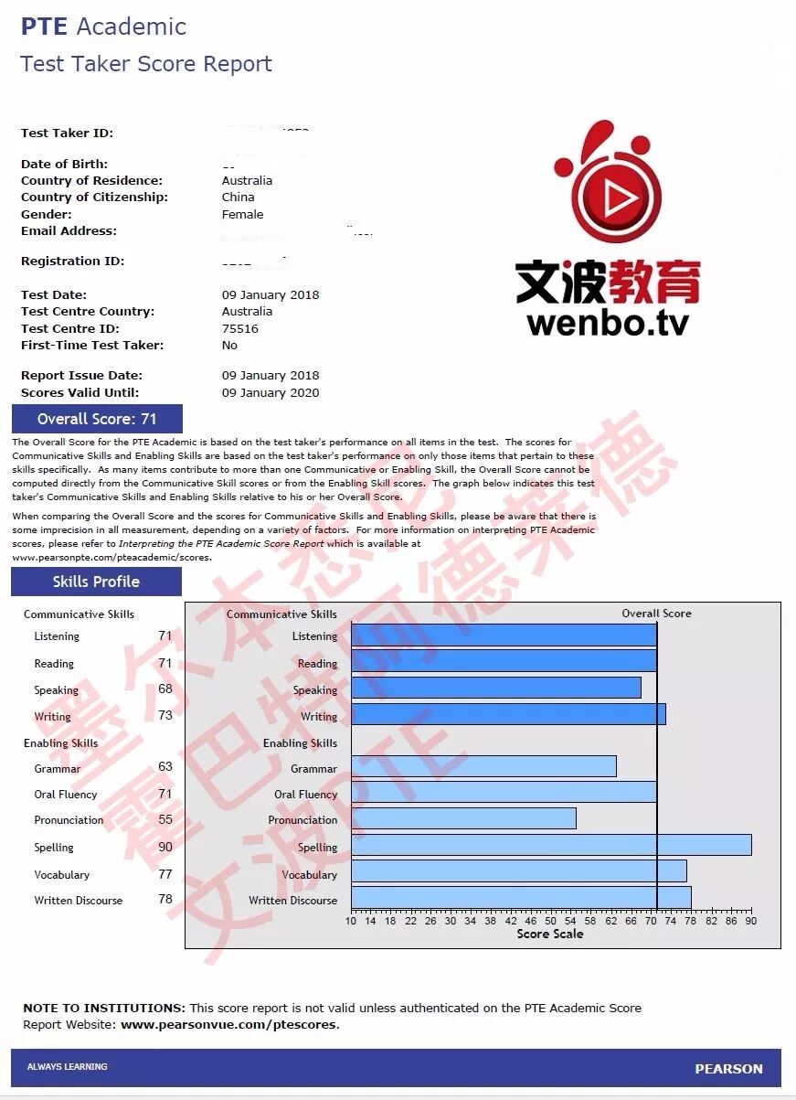 恭喜墨尔本悉尼霍巴特阿德莱德文波PTE学员Emilie同学获得听力72,阅读71,口语67,写作71,总分71分的好成绩!也是一月文波PTE第13位通过四个七四个八的学员。