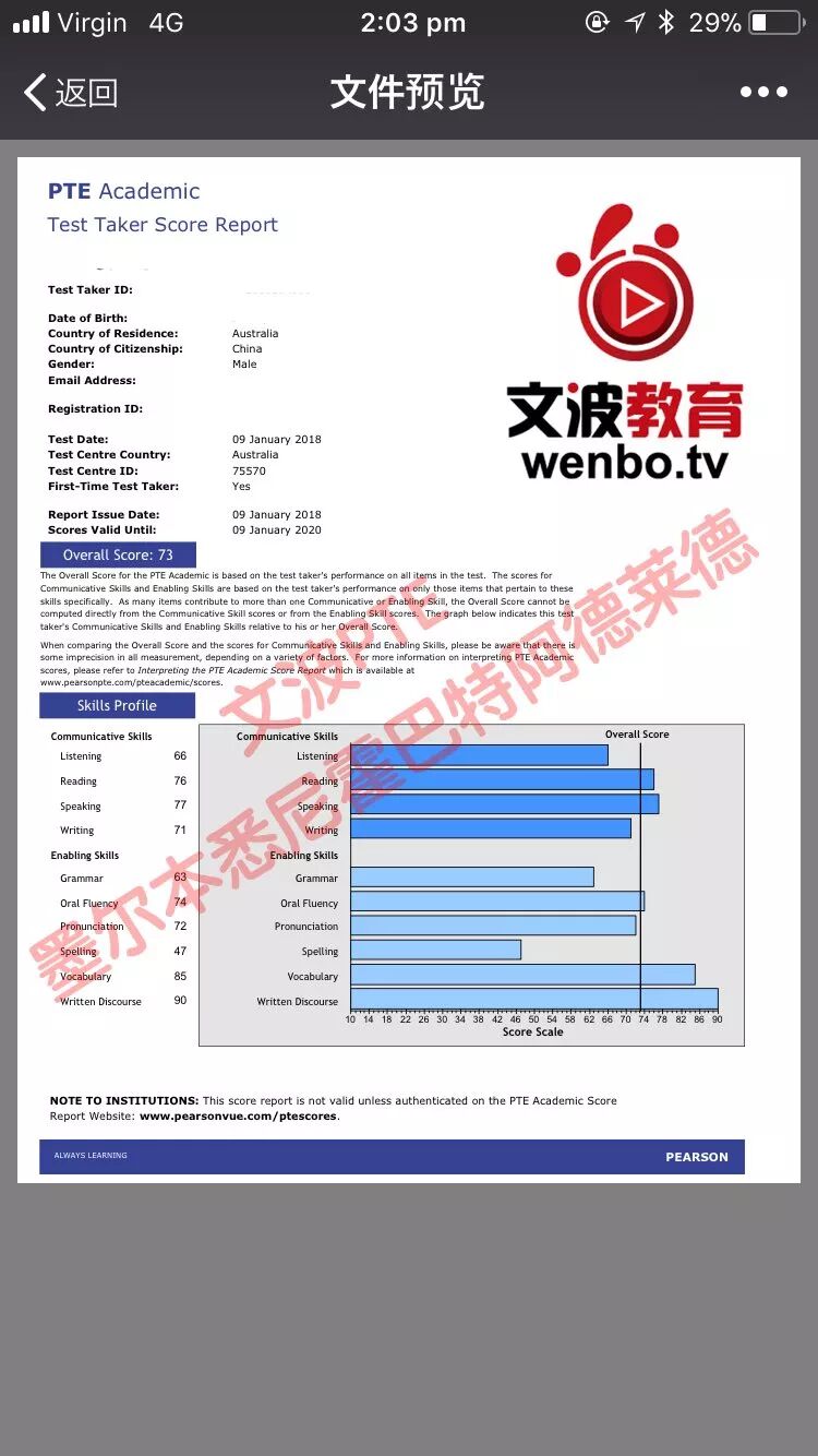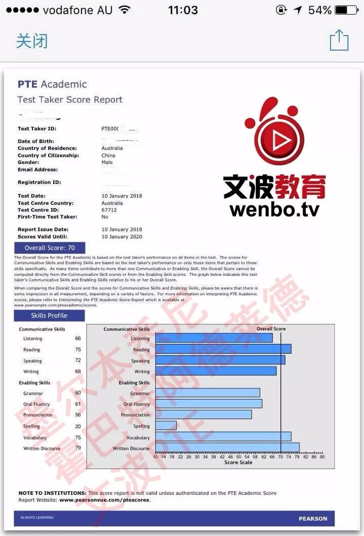 恭喜墨尔本悉尼霍巴特阿德莱德文波PTE学员Jason同学获得听力66,阅读75,口语72,写作68,总分70分的好成绩!也是一月文波PTE第15位通过四个七四个八的学员。