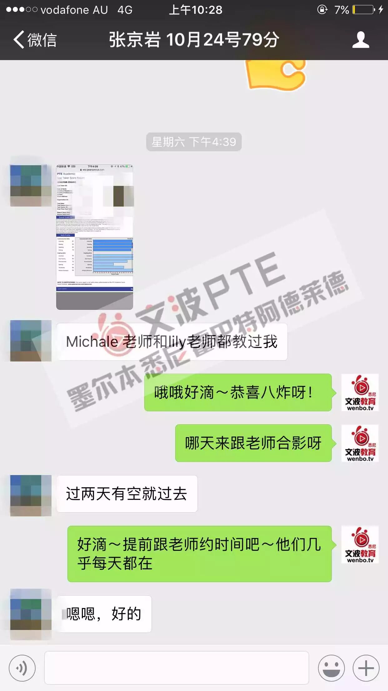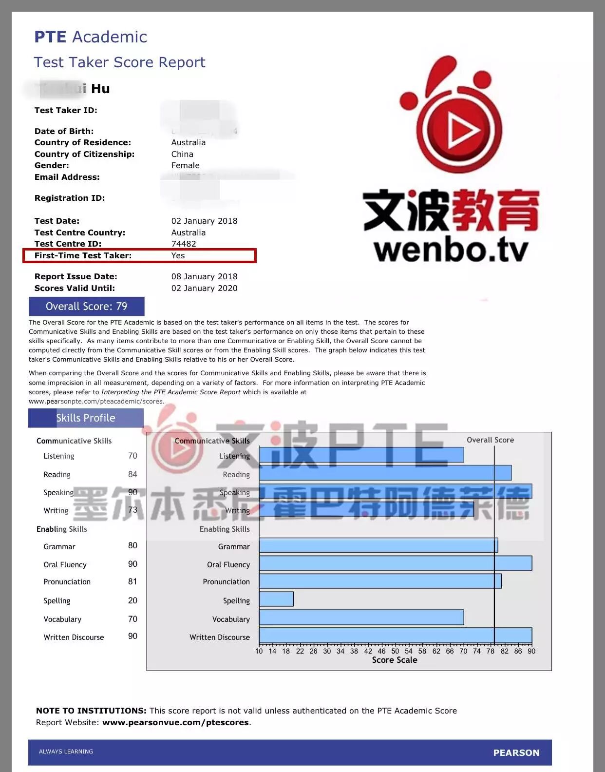 恭喜墨尔本悉尼霍巴特阿德莱德文波PTE学员Hu同学获得听力70,阅读84,口语90,写作73,总分79分的好成绩!也是一月文波PTE第17位通过四个七四个八的学员。