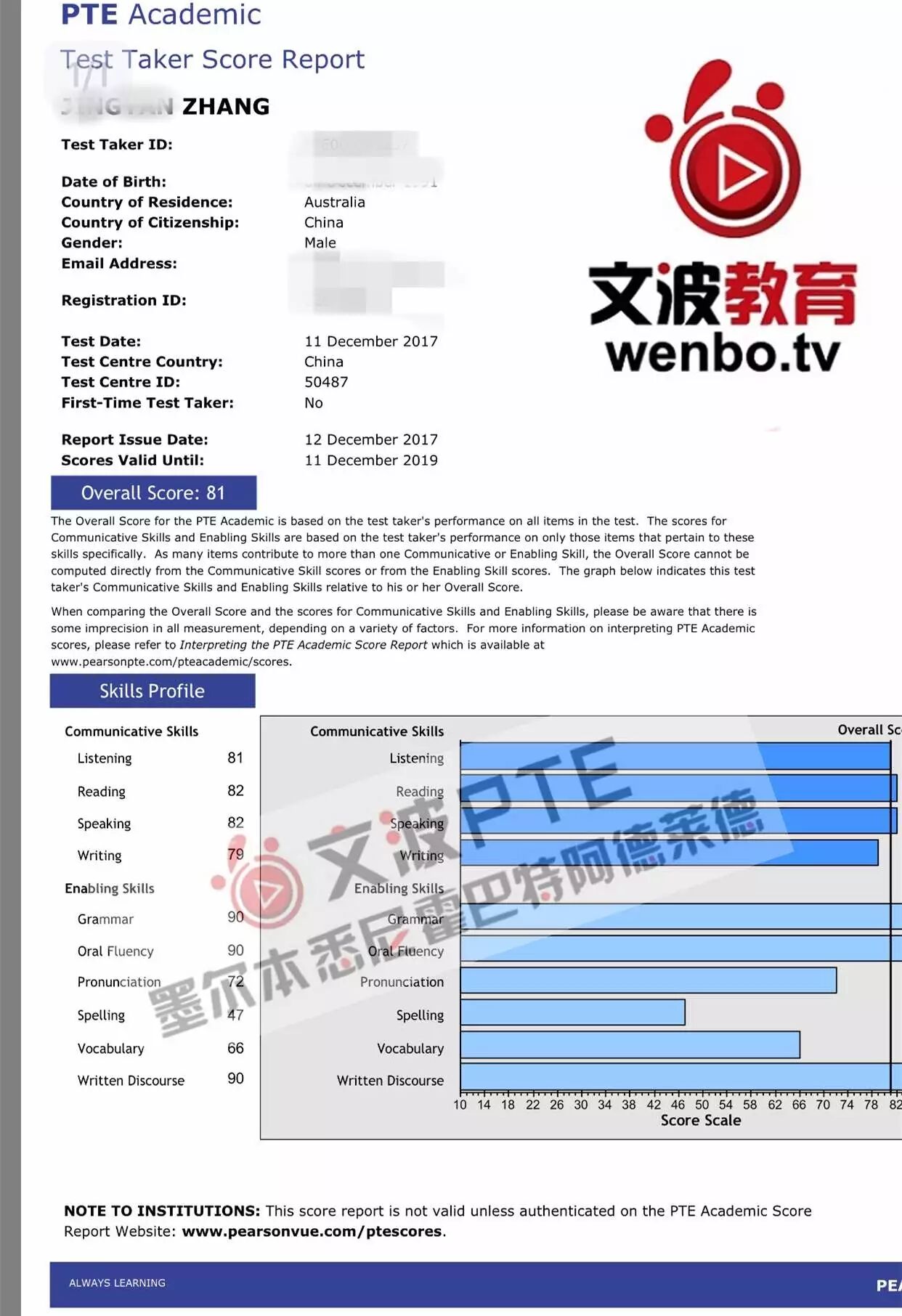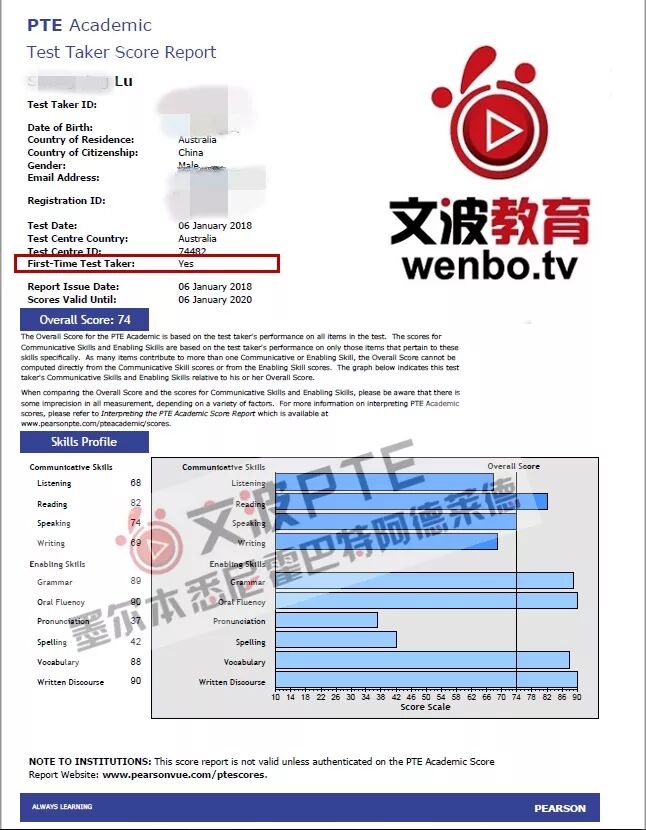 恭喜墨尔本悉尼霍巴特阿德莱德文波PTE学员Lucas同学获得听力81,阅读82,口语82,写作79,总分81分的好成绩!也是一月文波PTE第11位通过四个七四个八的学员。