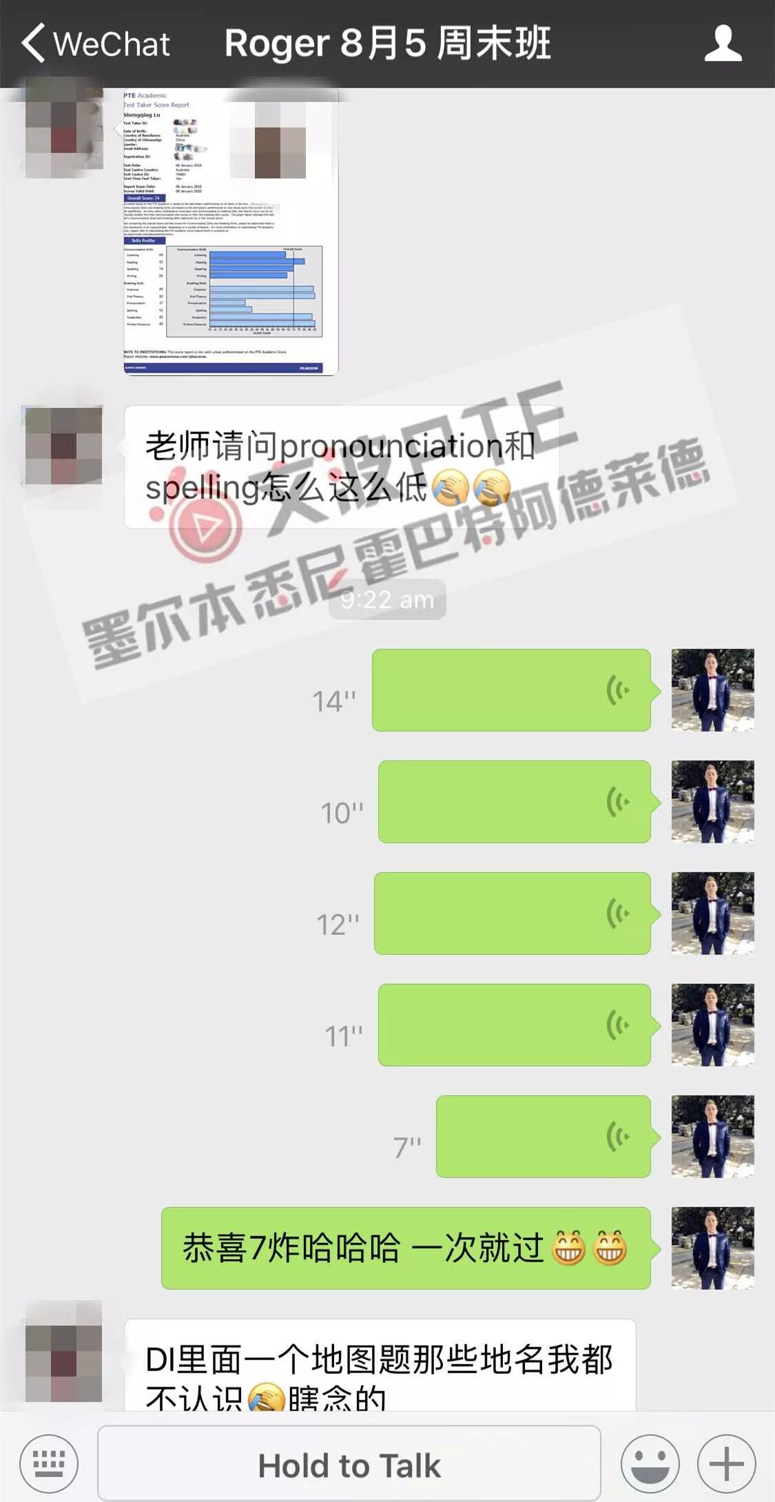 恭喜墨尔本悉尼霍巴特阿德莱德文波PTE学员Tong同学获得听力69,阅读75,口语70,写作77,总分72分的好成绩!也是一月文波PTE第19位通过四个七四个八的学员。