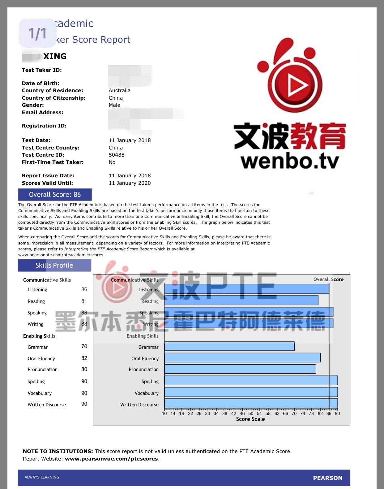 恭喜墨尔本悉尼霍巴特阿德莱德文波PTE学员Xing同学获得听力86,阅读81,口语88,写作88,总分86分的好成绩!也是一月文波PTE第18位通过四个七四个八的学员。