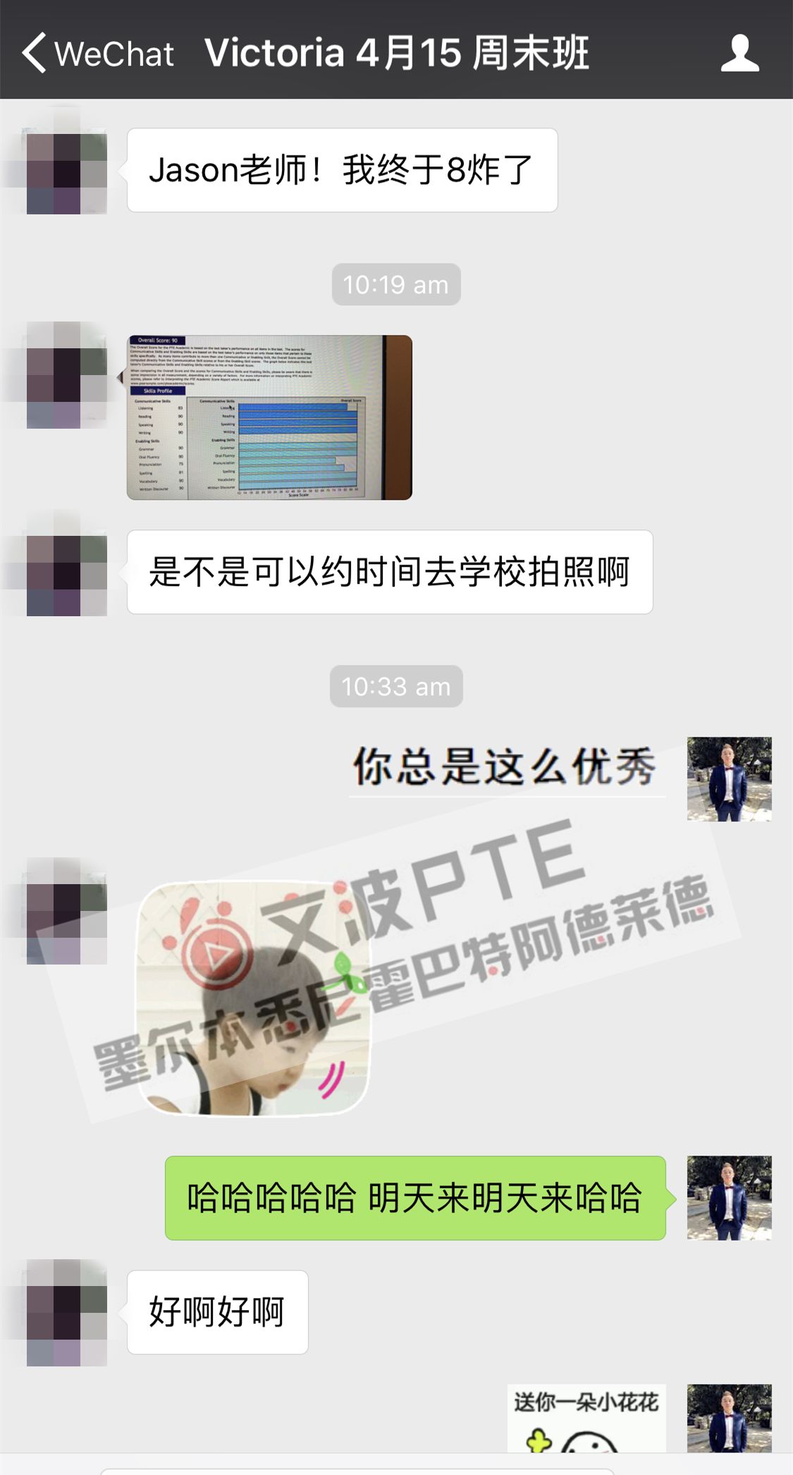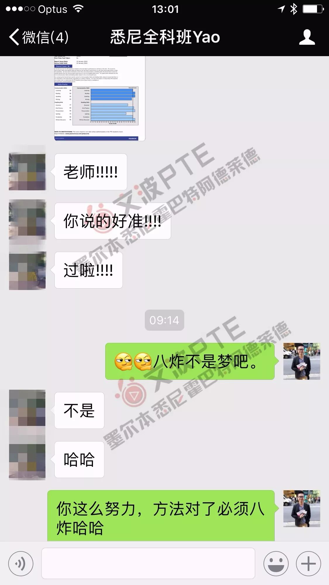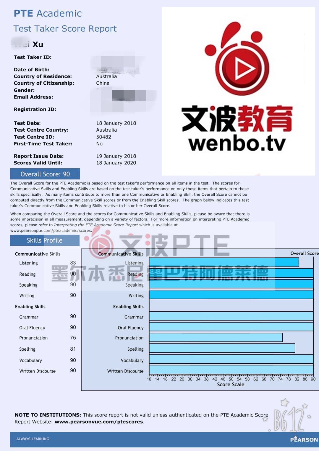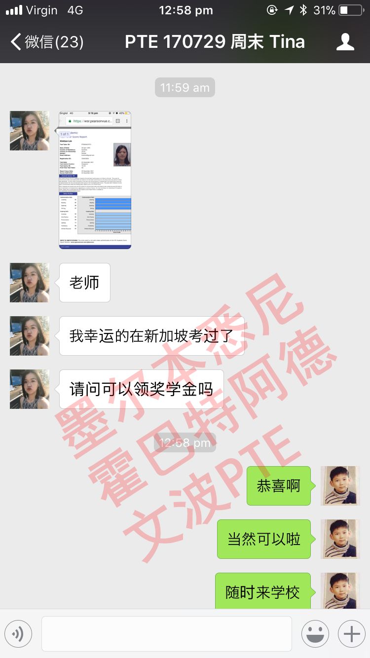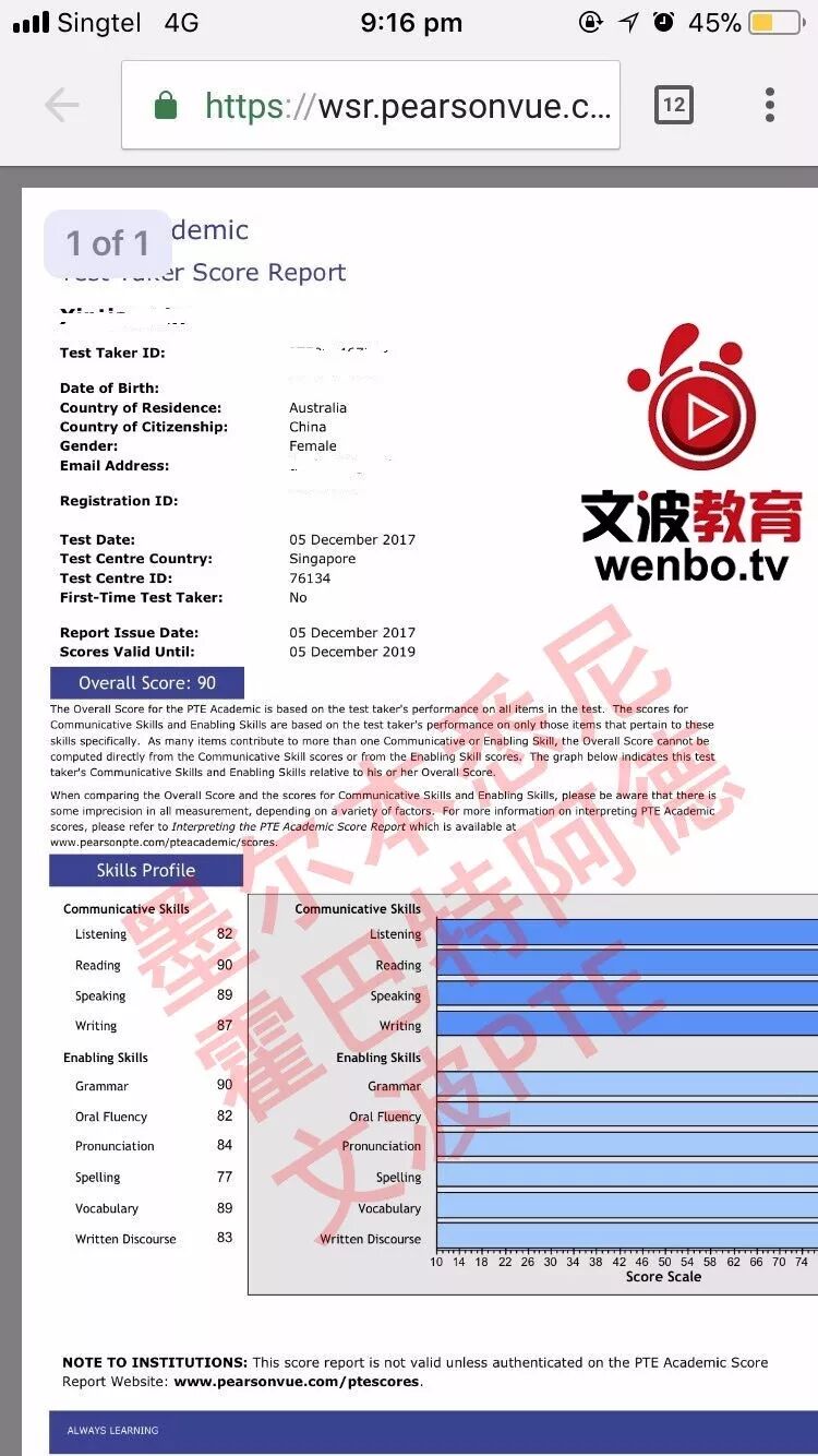 恭喜墨尔本悉尼霍巴特阿德莱德文波PTE学员Victoria同学获得听力83,阅读90,口语90,写作90,总分90分的好成绩!也是一月文波PTE第53位通过四个七四个八的学员。
