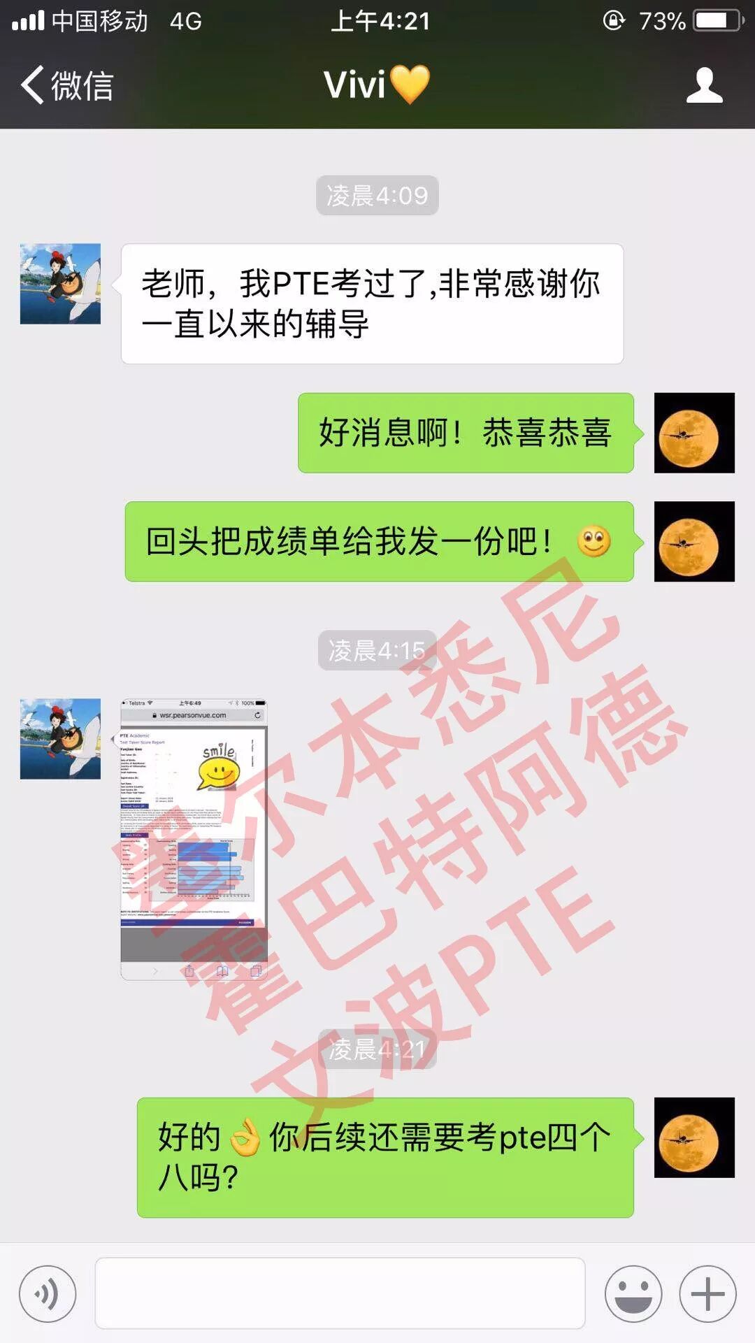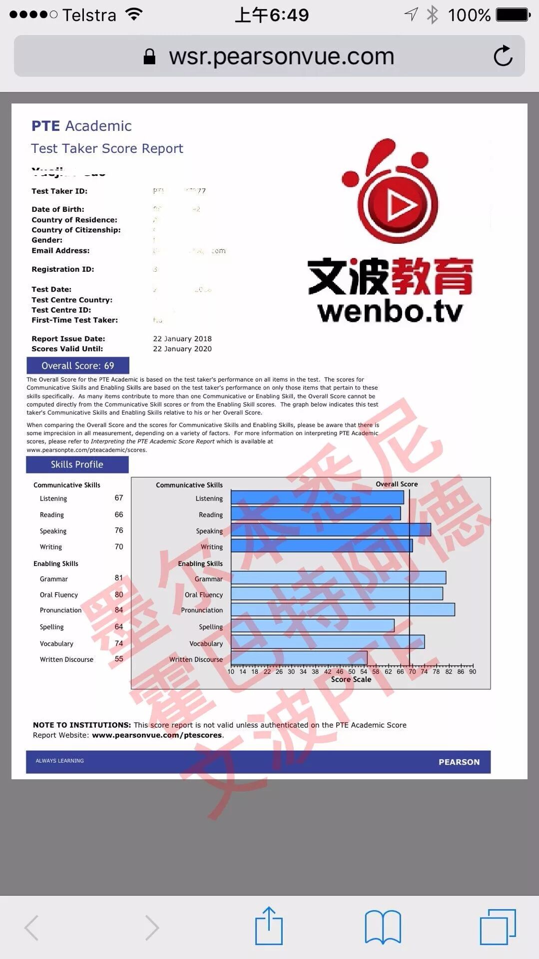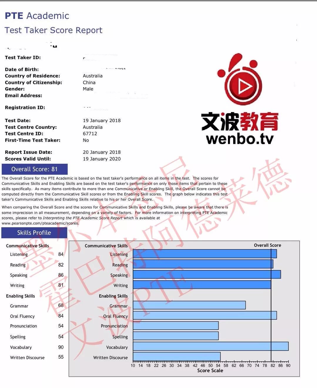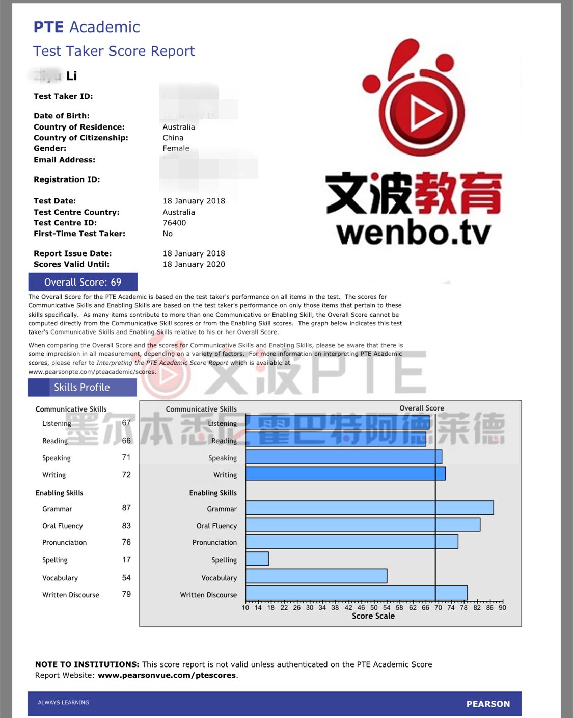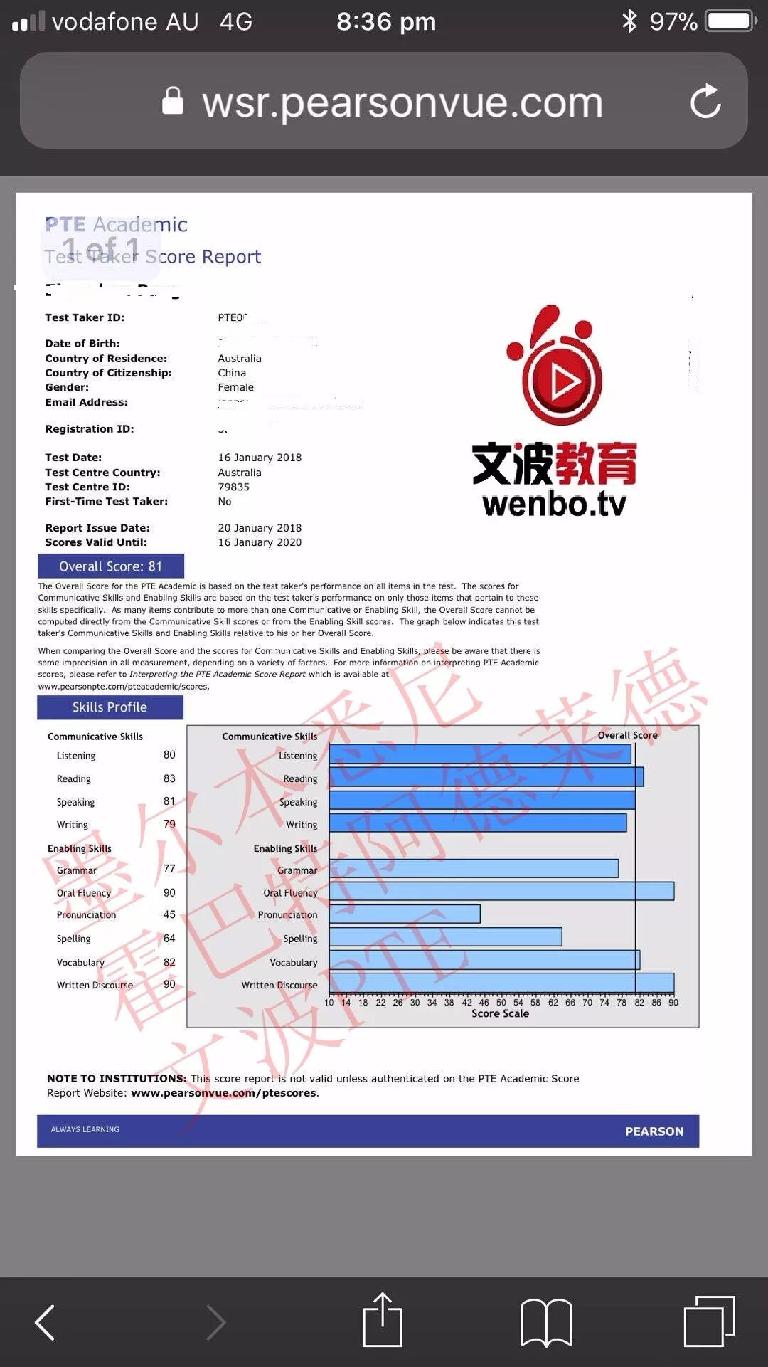 恭喜墨尔本悉尼霍巴特阿德莱德文波PTE学员Crystal同学获得听力80,阅读83,口语81,写作79,总分81分的好成绩!也是一月文波PTE第55位通过四个七四个八的学员。
