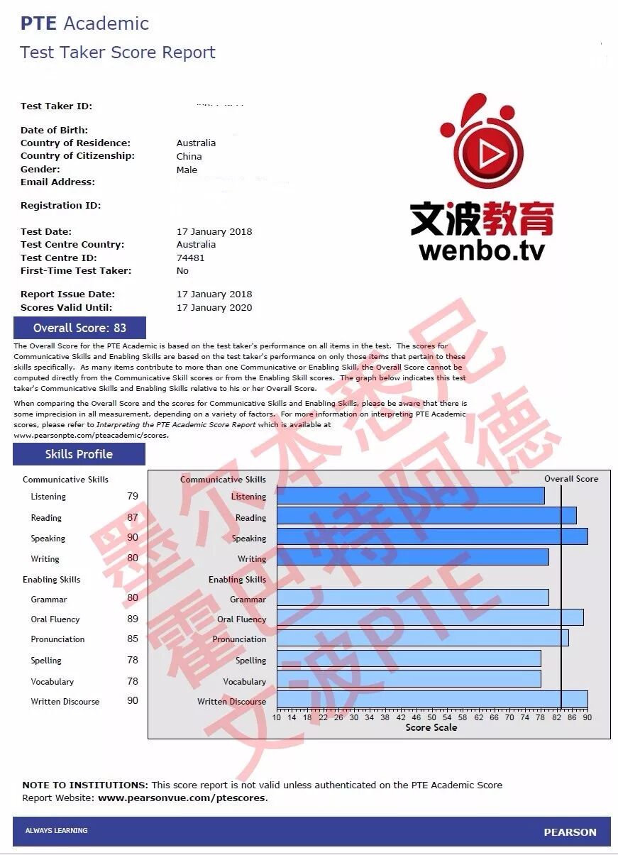 恭喜墨尔本悉尼霍巴特阿德莱德文波PTE学员Chen同学获得听力79,阅读87,口语90,写作80,总分83分的好成绩!也是一月文波PTE第58位通过四个七四个八的学员。