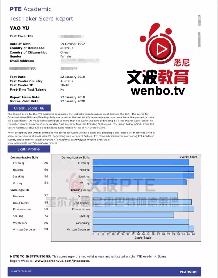 恭喜墨尔本悉尼霍巴特阿德莱德文波PTE学员Yao同学获得听力86,阅读90,口语90,写作84,总分86分的好成绩!也是一月文波PTE第59位通过四个七四个八的学员。