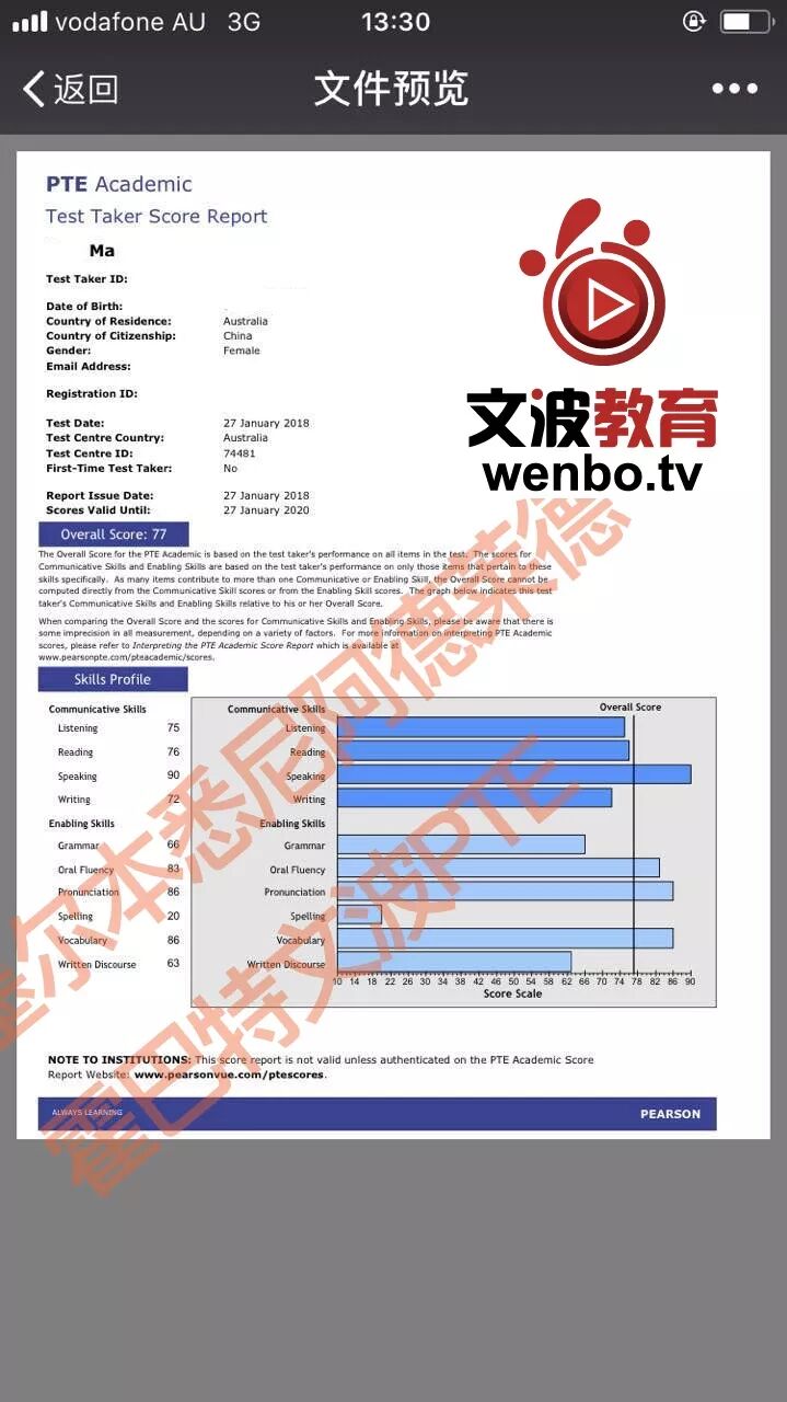 恭喜墨尔本悉尼霍巴特阿德莱德文波PTE学员Ma同学获得听力75,阅读76,口语90,写作72,总分77分的好成绩!也是一月文波PTE第87位通过四个七四个八的学员。