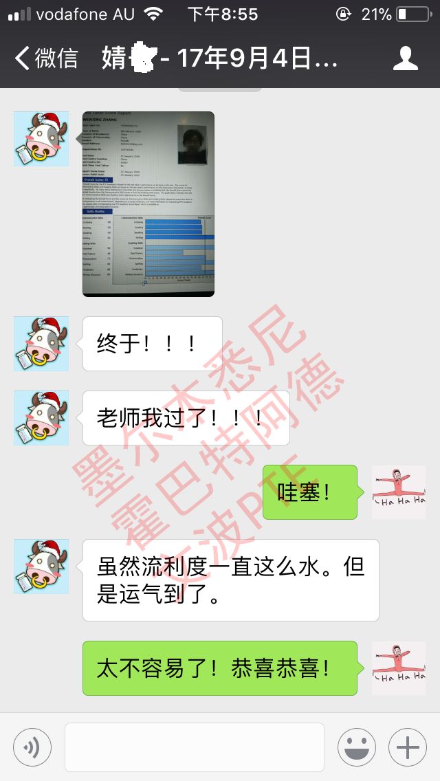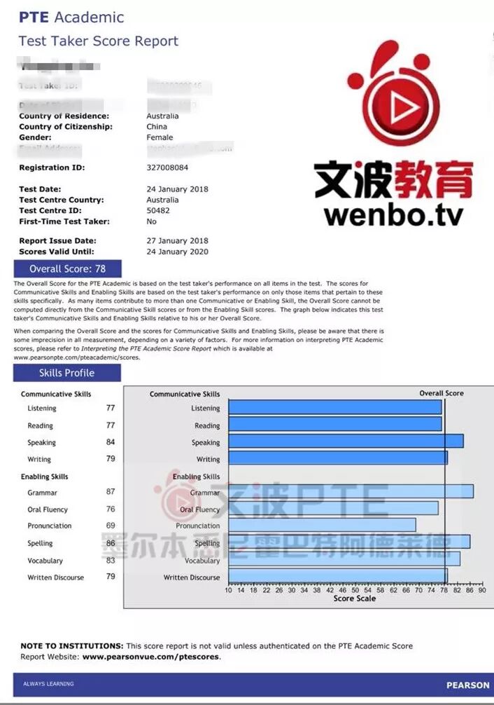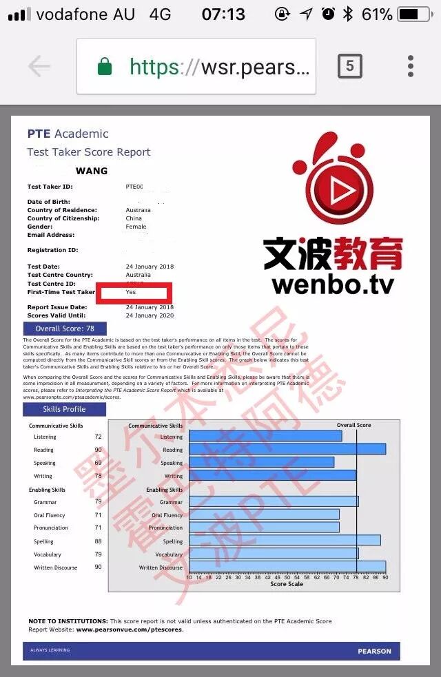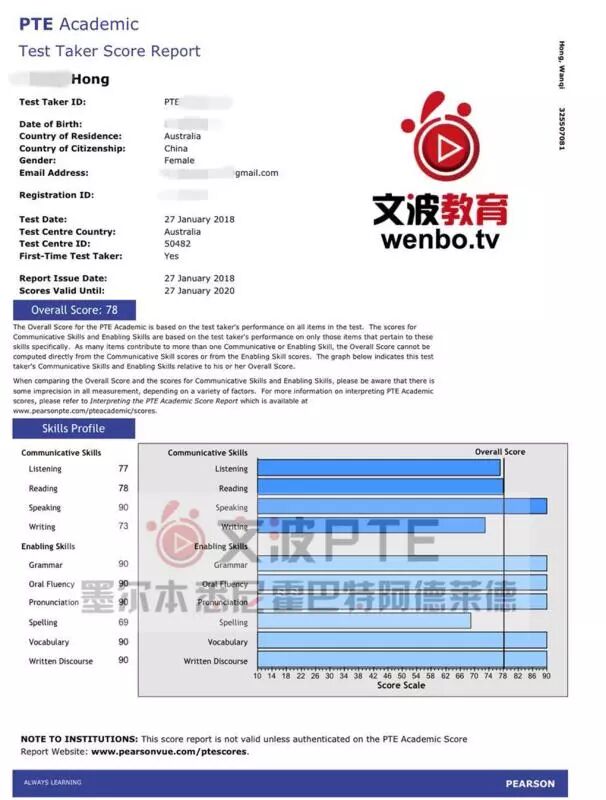 恭喜墨尔本悉尼霍巴特阿德莱德文波PTE学员Wang同学获得听力72,阅读90,口语69,写作78,总分78分的好成绩!也是一月文波PTE第81位通过四个七四个八的学员。
