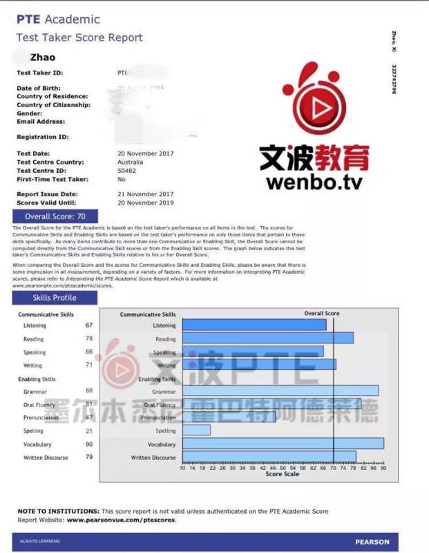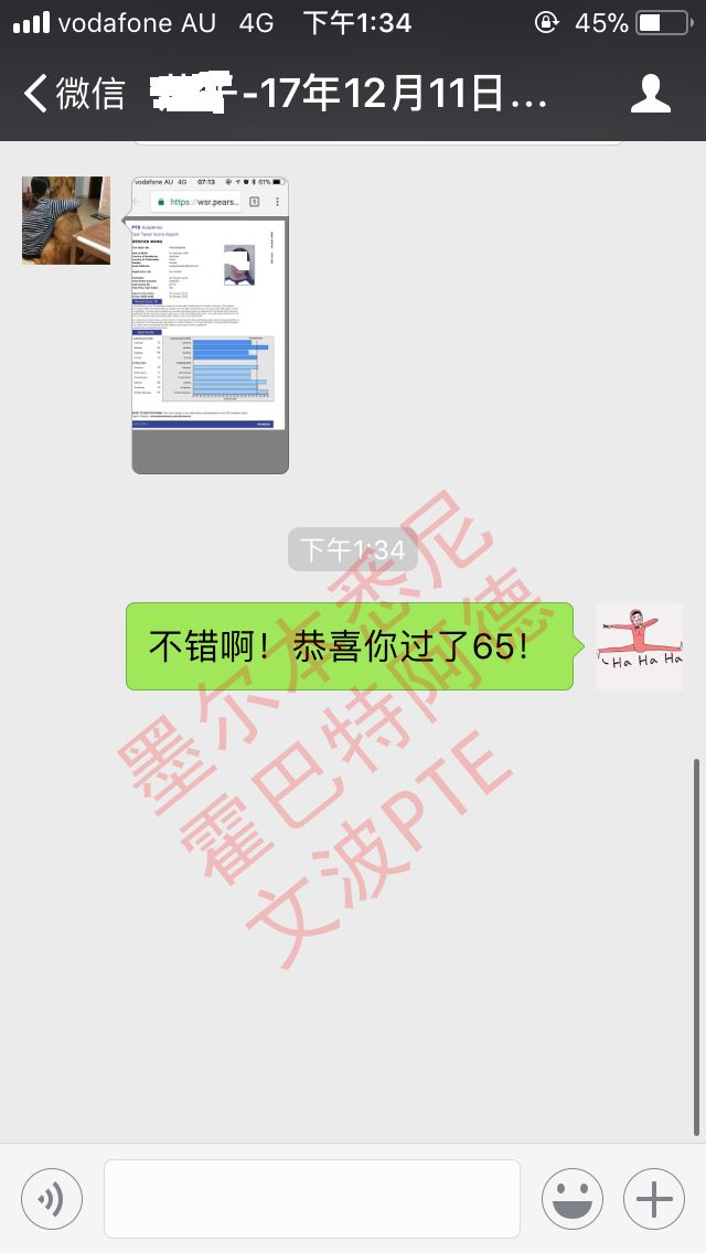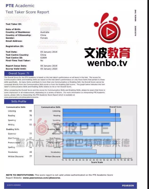 恭喜墨尔本悉尼霍巴特阿德莱德文波PTE学员Gris同学获得听力65,阅读76,口语77,写作65,总分71分的好成绩!也是一月文波PTE第86位通过四个七四个八的学员。
