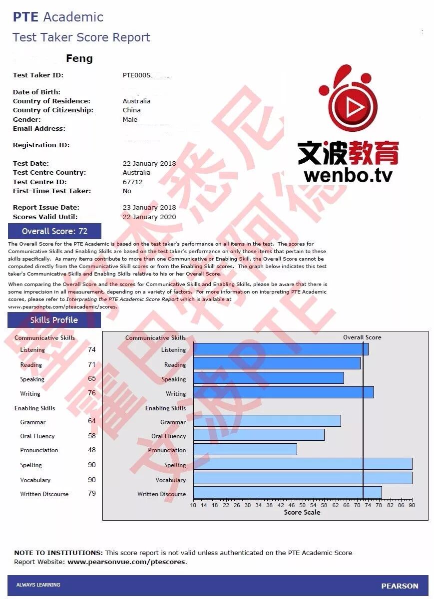 恭喜墨尔本悉尼霍巴特阿德莱德文波PTE学员Feng同学获得听力74,阅读71,口语65,写作76,总分72分的好成绩!也是一月文波PTE第89位通过四个七四个八的学员。