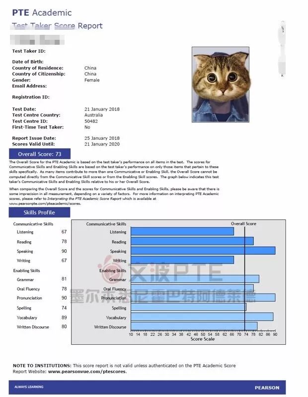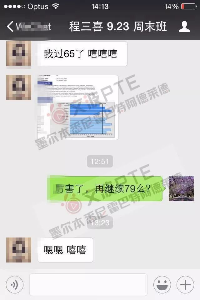 恭喜墨尔本悉尼霍巴特阿德莱德文波PTE学员Cheng同学获得听力67,阅读78,口语90,写作67,总分73分的好成绩!也是一月文波PTE第83位通过四个七四个八的学员。