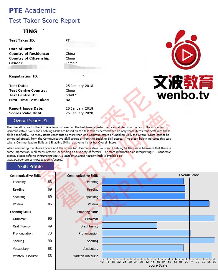 恭喜墨尔本悉尼霍巴特阿德莱德文波PTE学员Jing同学获得听力68,阅读69,口语69,写作86,总分72分的好成绩!也是一月文波PTE第82位通过四个七四个八的学员。