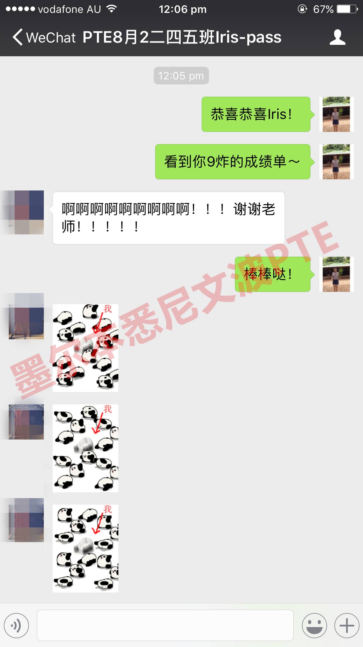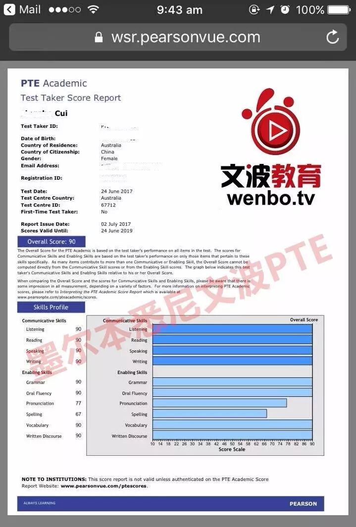 喜墨尔本悉尼文波PTE学员Iris获得听力90,阅读90,口语90,写作90,总分90分的好成绩!也是七月文波PTE第8位通过四个七四个八的学员.