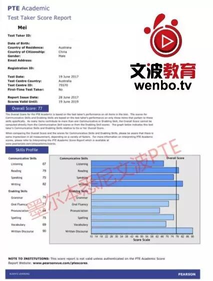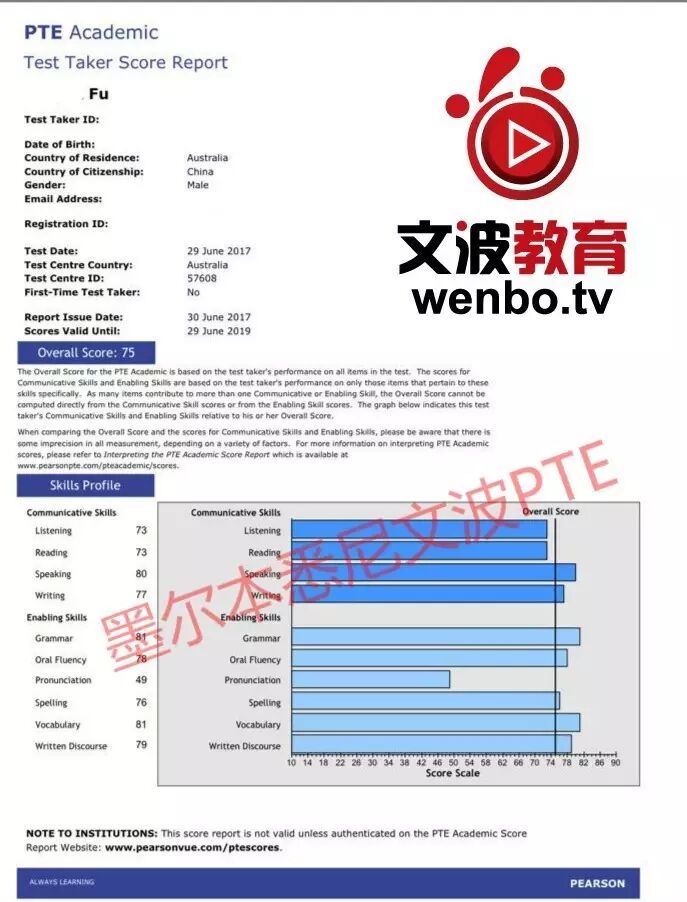 恭喜墨尔本悉尼文波PTE学员Fu获得听力73,阅读73,口语80,写作77,总分75分的好成绩!也是七月文波PTE第1位通过四个七四个八的学员.