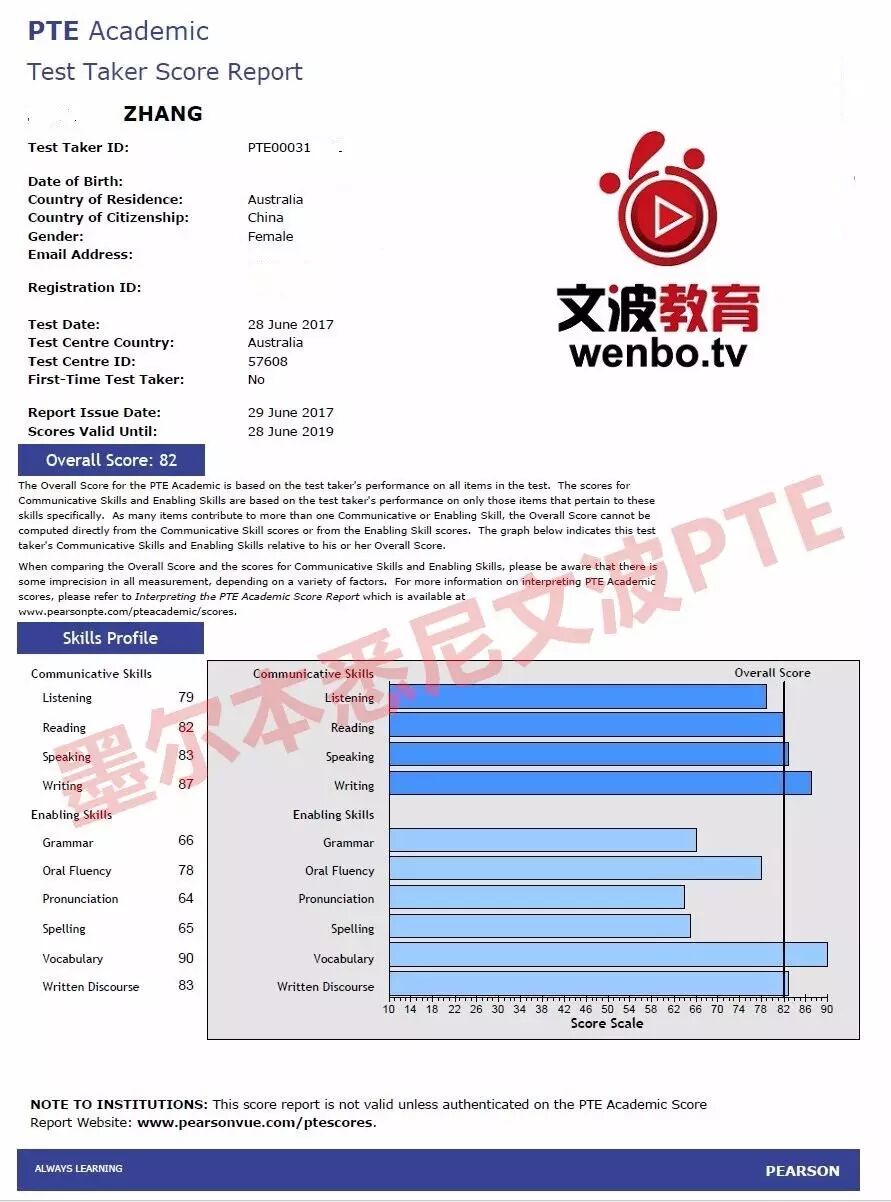 恭喜墨尔本悉尼文波PTE学员Jill获得听力79,阅读82,口语83,写作87,总分82分的好成绩!也是七月文波PTE第10位通过四个七四个八的学员.