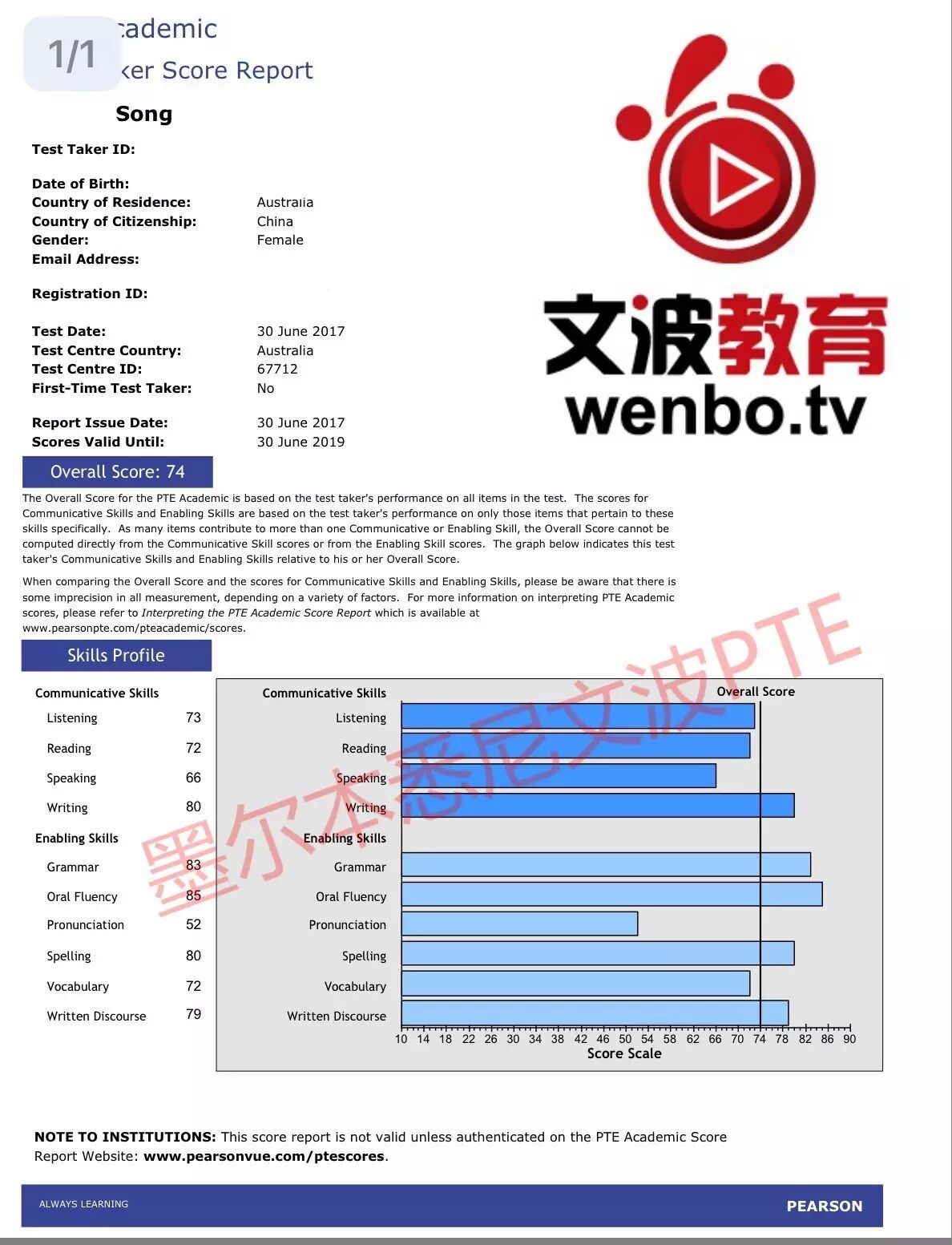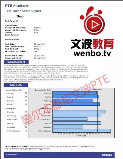 恭喜墨尔本悉尼文波PTE学员Zhao获得听力71,阅读74,口语66,写作75,总分72分的好成绩!也是七月文波PTE第5位通过四个七四个八的学员.