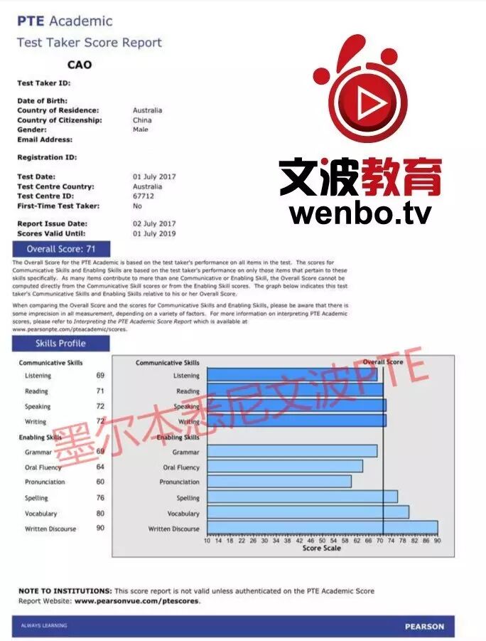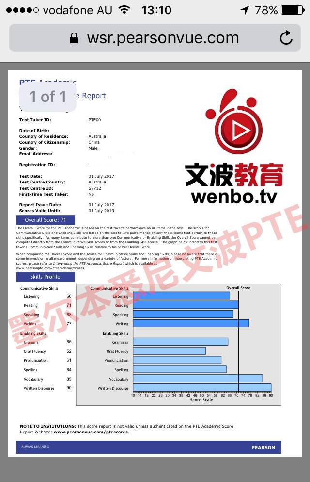 恭喜墨尔本悉尼文波PTE学员Nick获得听力69,阅读71,口语72,写作72,总分71分的好成绩!也是七月文波PTE第7位通过四个七四个八的学员.