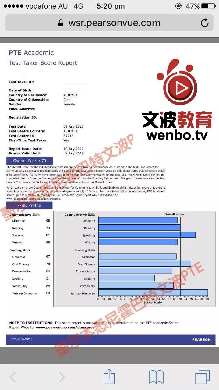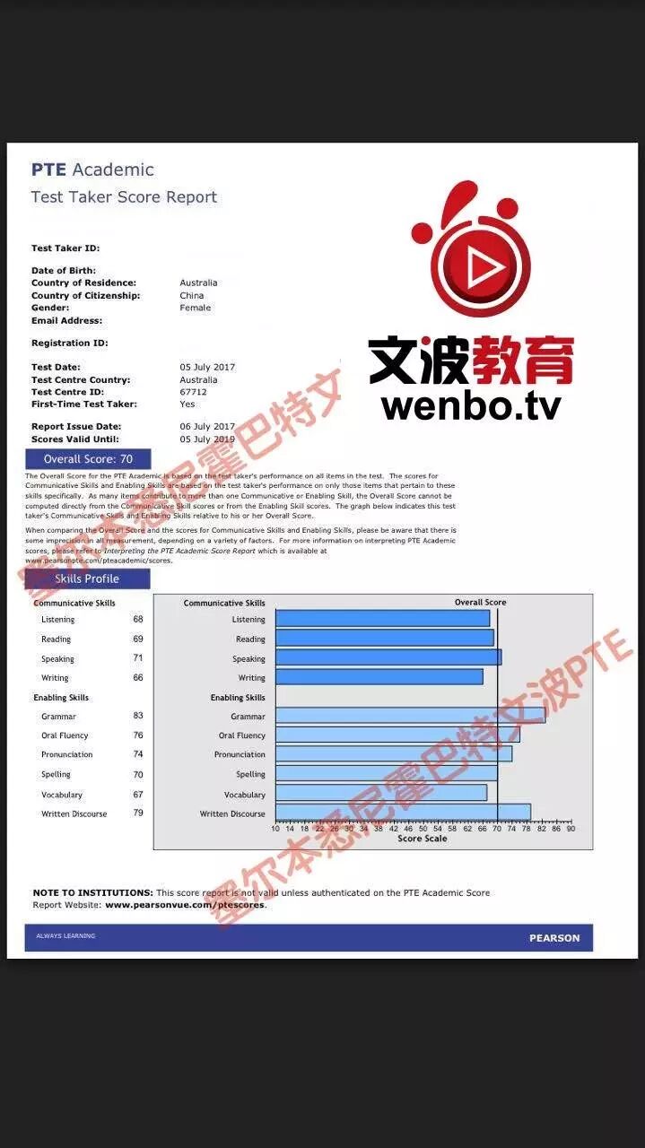 恭喜墨尔本悉尼文波PTE学员Helen获得听力68,阅读70,口语81,写作68,总分70分的好成绩!也是七月文波PTE第34位通过四个七四个八的学员.