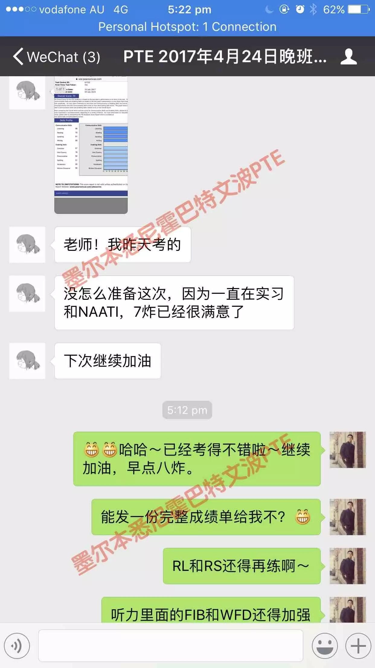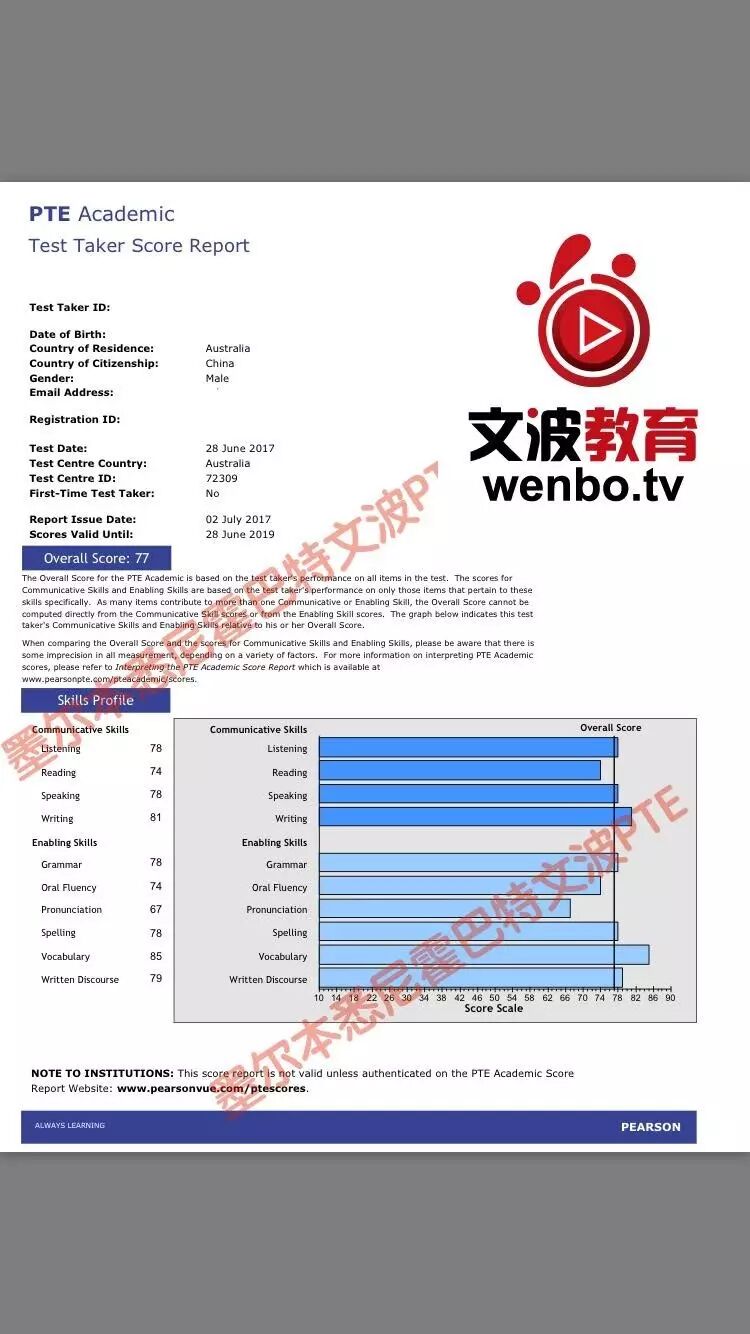 恭喜墨尔本悉尼文波PTE学员Robert获得听力78,阅读74,口语78,写作81,总分77分的好成绩!也是七月文波PTE第33位通过四个七四个八的学员.