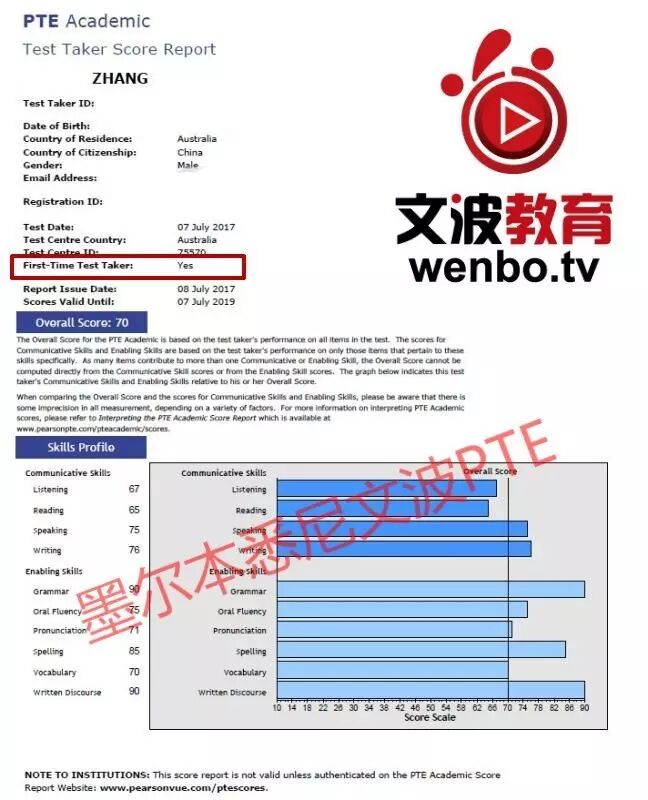 恭喜墨尔本悉尼文波PTE学员Zhang获得听力67,阅读65,口语75,写作76,总分70分的好成绩!也是七月文波PTE第31位通过四个七四个八的学员.