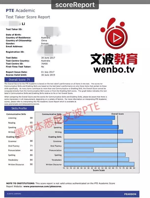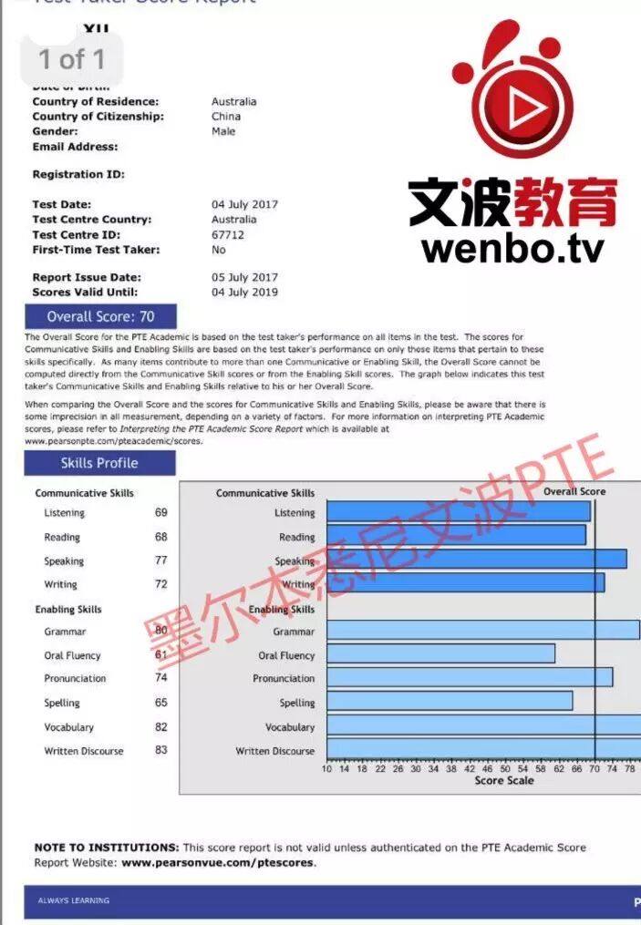 恭喜墨尔本悉尼文波PTE学员Sunny获得听力68,阅读69,口语71,写作66,总分70分的好成绩!也是七月文波PTE第32位通过四个七四个八的学员.