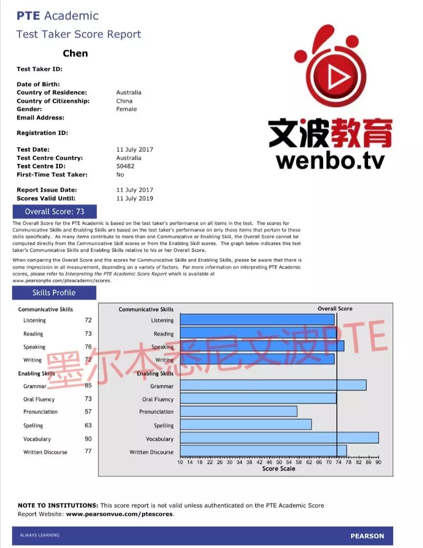 恭喜墨尔本悉尼文波PTE学员Amelie获得听力72,阅读73,口语76,写作72,总分73分的好成绩!也是七月文波PTE第39位通过四个七四个八的学员.