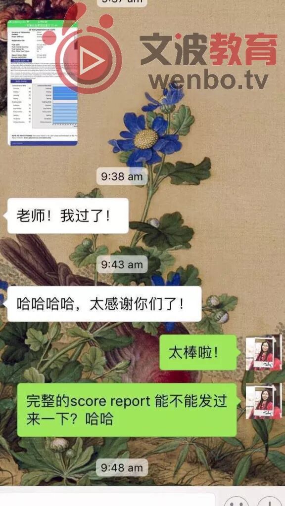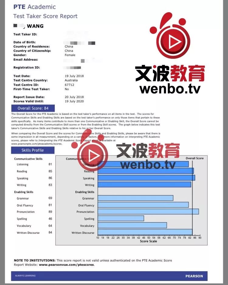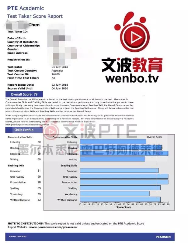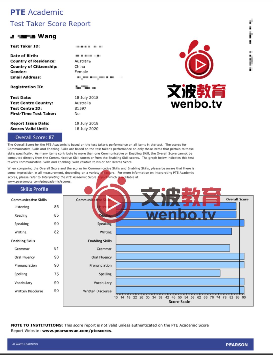 恭喜墨尔本悉尼霍巴特阿德莱德文波PTE学员Wang同学获得听力85,阅读85,口语90,写作82,总分87的好成绩!也是7月文波PTE第43位通过四个七四个八的学员。