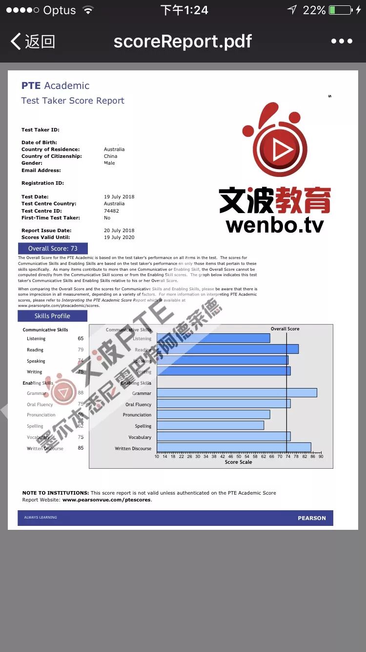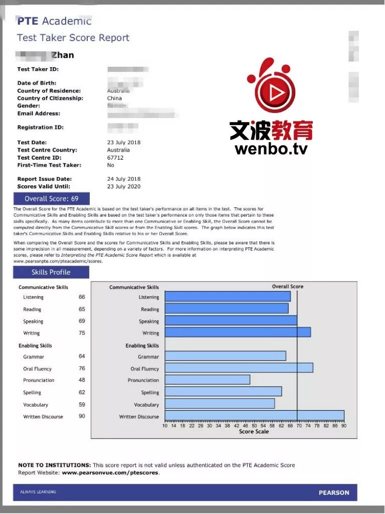 恭喜墨尔本悉尼霍巴特阿德莱德文波PTE学员Zhan同学获得听力66,阅读65,口语69,写作75,总分69的好成绩!也是7月文波PTE第50位通过四个七四个八的学员。
