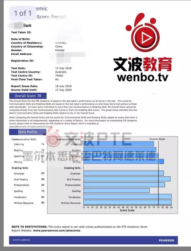 恭喜墨尔本悉尼霍巴特阿德莱德文波PTE学员Anne同学获得听力74,阅读76,口语78,写作83,总分78分的好成绩!也是七月文波PTE第44位通过四个七四个八的学员。