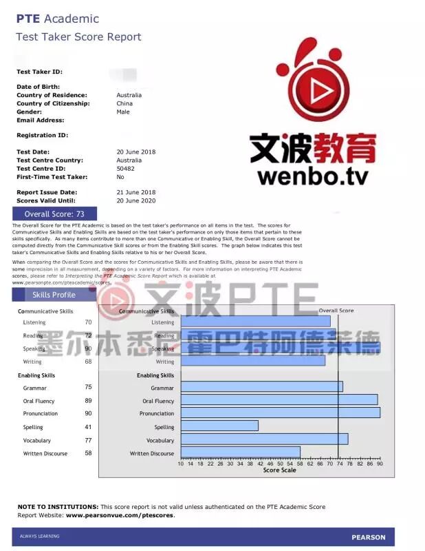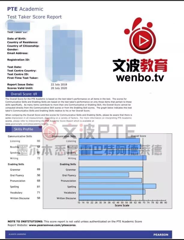 恭喜墨尔本悉尼霍巴特阿德莱德文波PTE学员LI同学获得听力66,阅读67,口语66,写作72,总分69分的好成绩!也是七月文波PTE第46位通过四个七四个八的学员。
