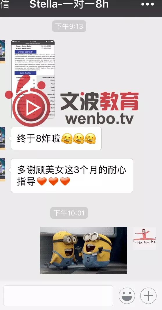 8炸!恭喜墨尔本悉尼霍巴特阿德莱德文波PTE学员Stella同学获得听力81,阅读85,口语86,写作83,总分84分的好成绩!也是七月文波PTE第41位通过四个七四个八的学员。