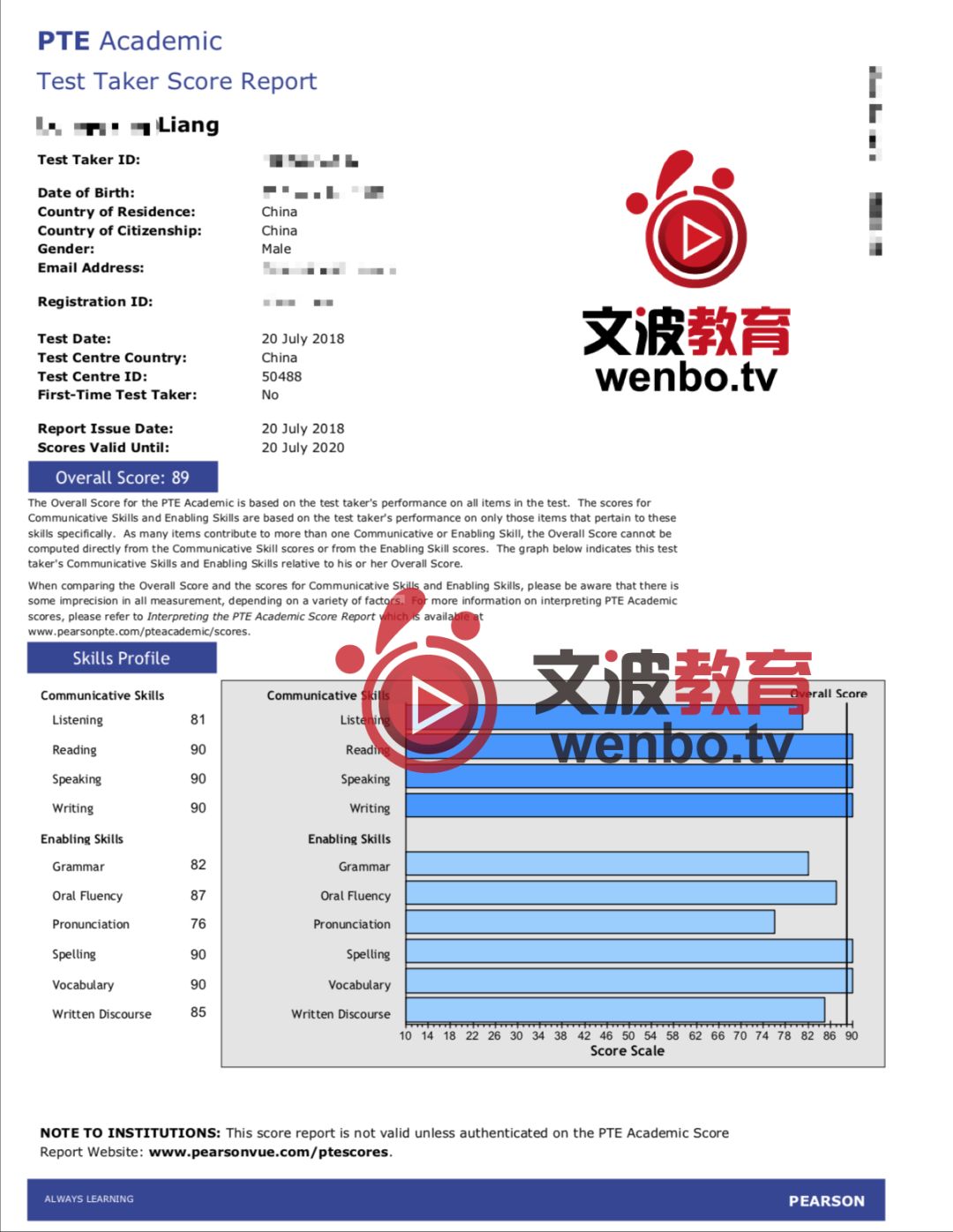 恭喜墨尔本悉尼霍巴特阿德莱德文波PTE学员Liang同学获得听力81,阅读90,口语90,写作90,总分89分的好成绩!也是7月文波PTE第42位通过四个七四个八的学员。