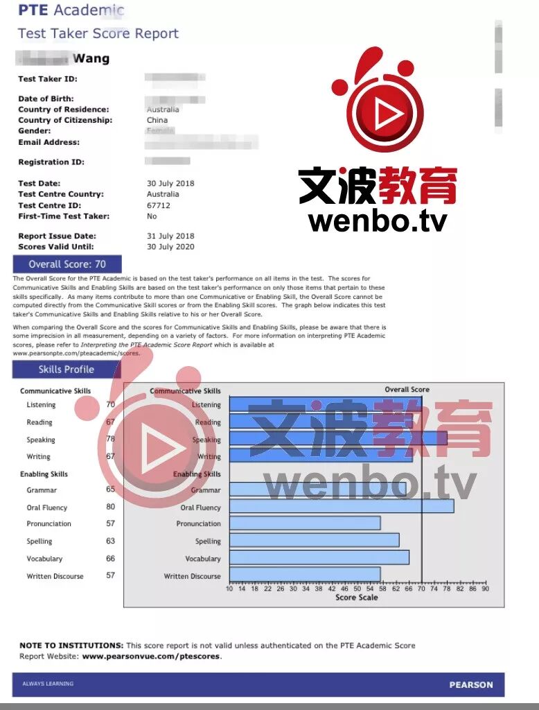 恭喜墨尔本悉尼霍巴特阿德莱德文波PTE学员Wang同学获得听力70,阅读67,口语78,写作67,总分70的好成绩!也是7月文波PTE第89位通过四个七四个八的学员