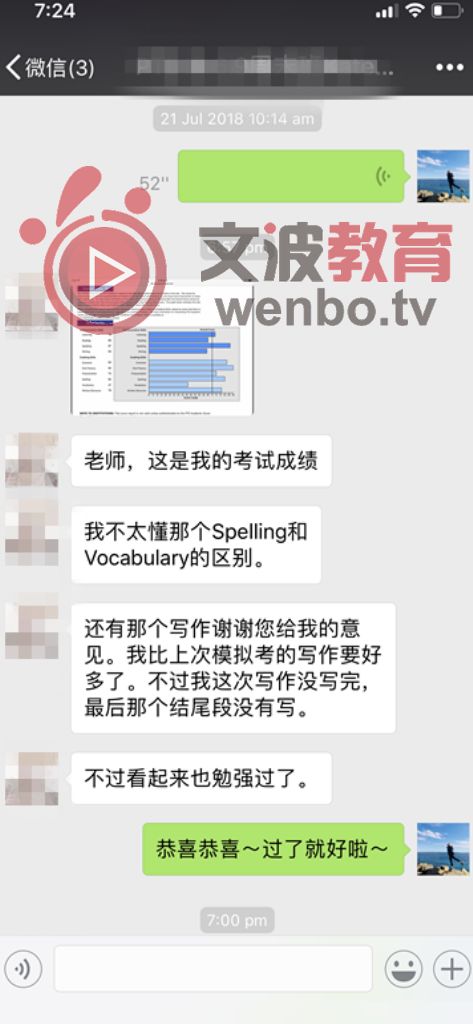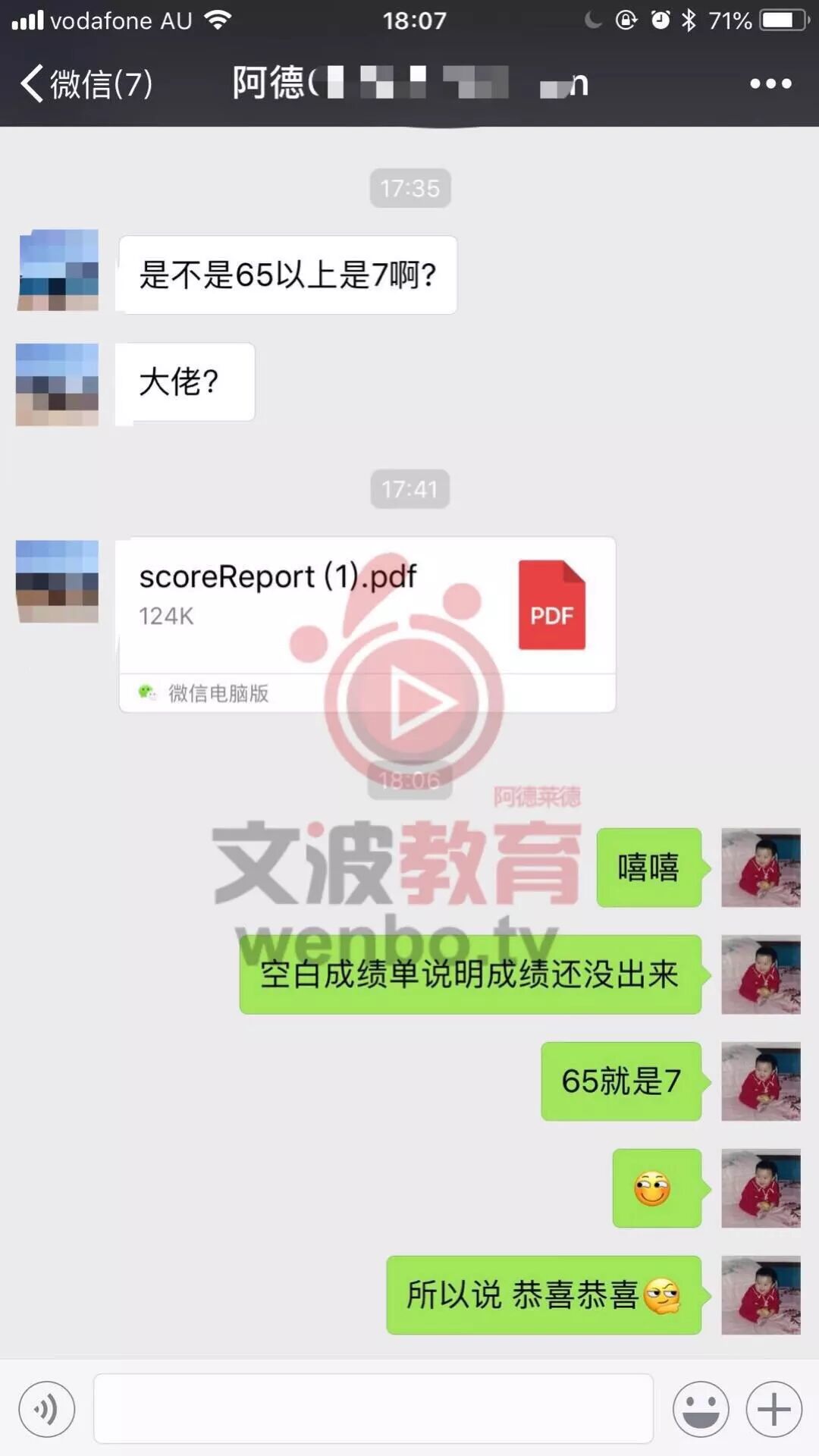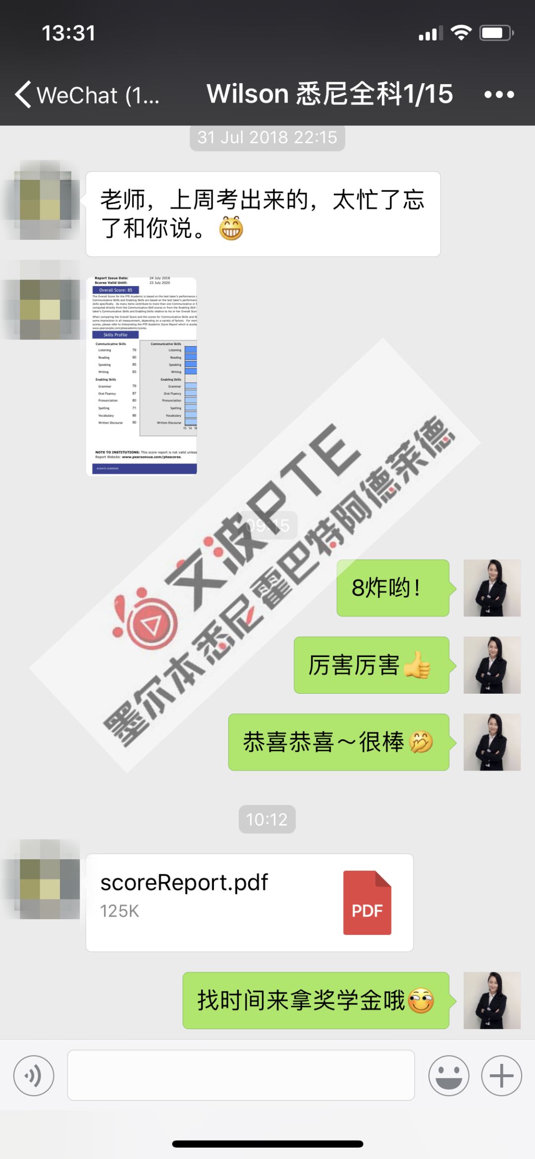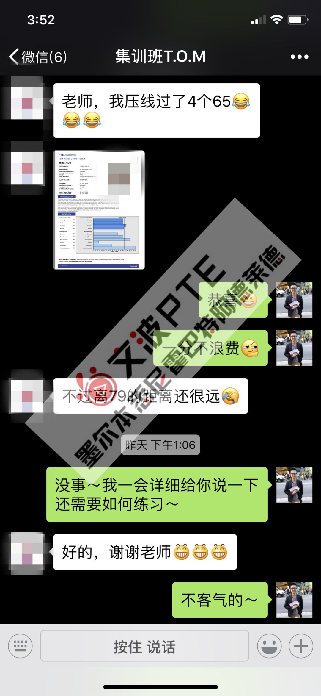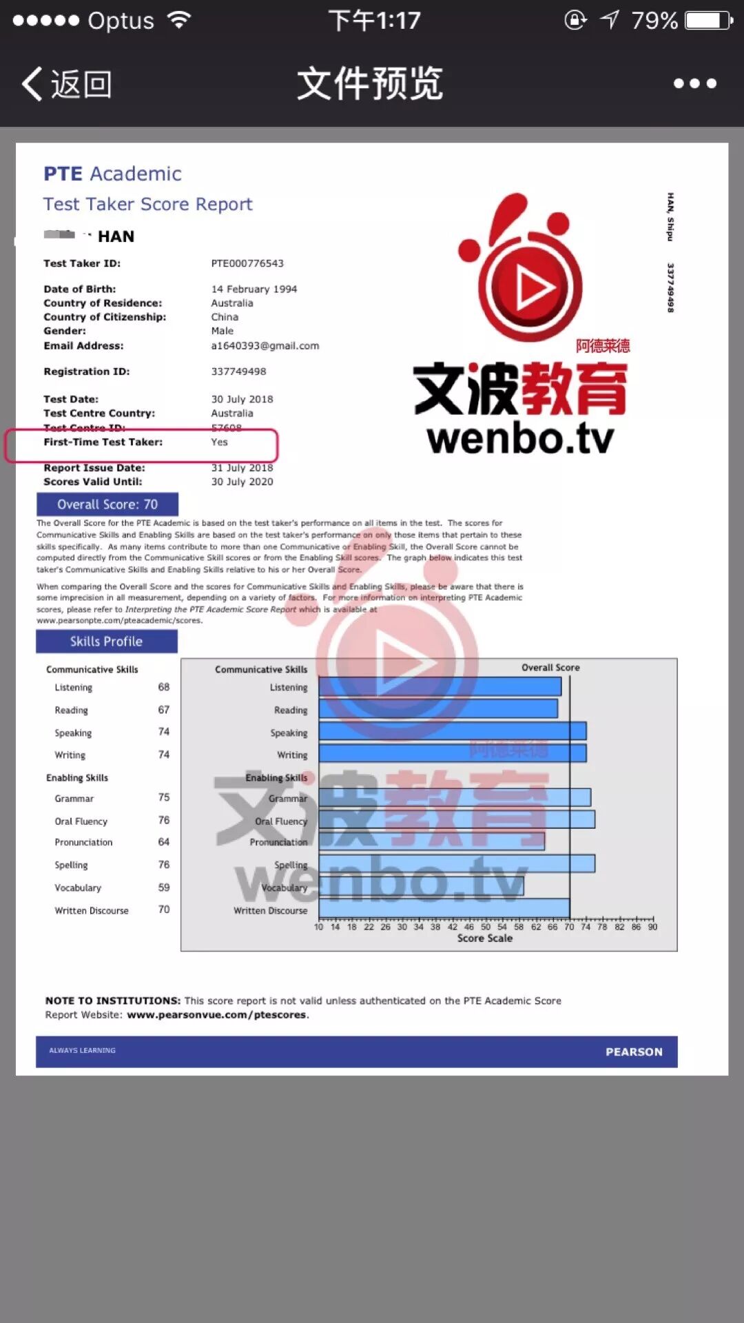 恭喜墨尔本悉尼霍巴特阿德莱德文波PTE学员Han同学获得听力68,阅读67,口语74,写作74,总分70的好成绩!也是7月文波PTE第84位通过四个七四个八的学员