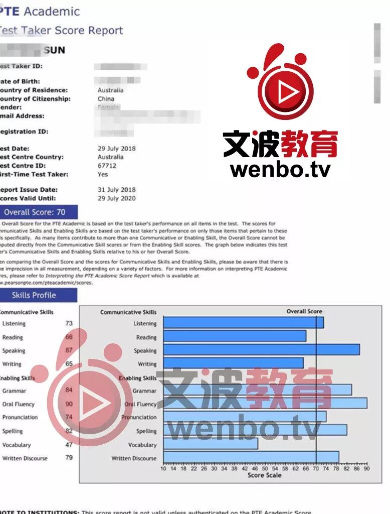 恭喜墨尔本悉尼霍巴特阿德莱德文波PTE学员Sun同学获得听力73,阅读66,口语87,写作65,总分70的好成绩!也是7月文波PTE第85位通过四个七四个八的学员