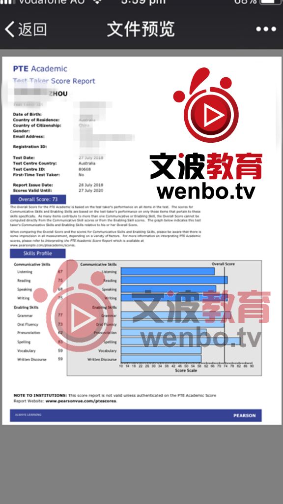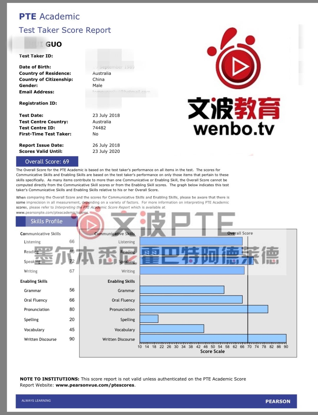恭喜墨尔本悉尼霍巴特阿德莱德文波PTE学员Guo同学获得听力66,阅读66,口语72,写作67,总分69的好成绩!也是7月文波PTE第88位通过四个七四个八的学员