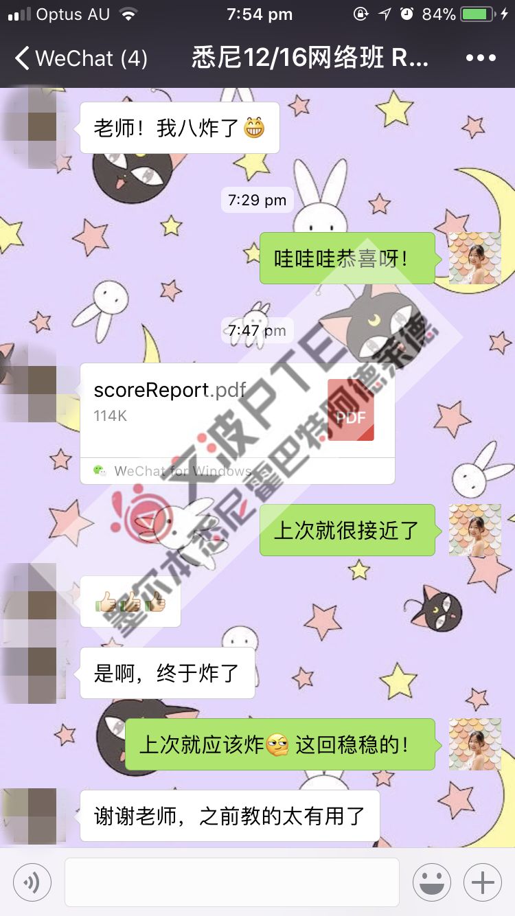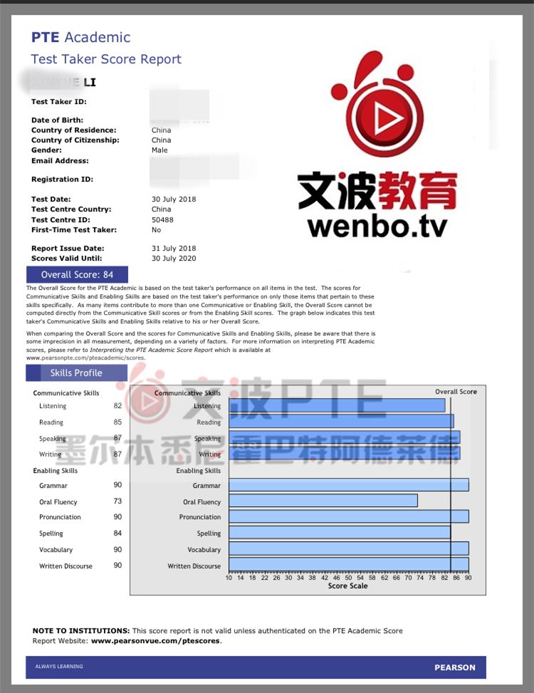 恭喜墨尔本悉尼霍巴特阿德莱德文波PTE学员Li同学获得听力82,阅读85,口语87,写作87,总分84的好成绩!也是7月文波PTE第83位通过四个七四个八的学员