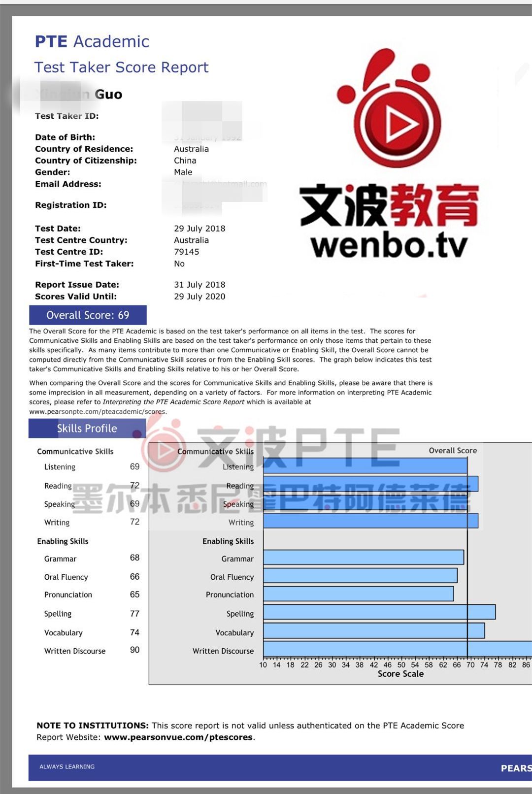 恭喜墨尔本悉尼霍巴特阿德莱德文波PTE学员Guo同学获得听力69,阅读72,口语69,写作72,总分69的好成绩!也是7月文波PTE第87位通过四个七四个八的学员