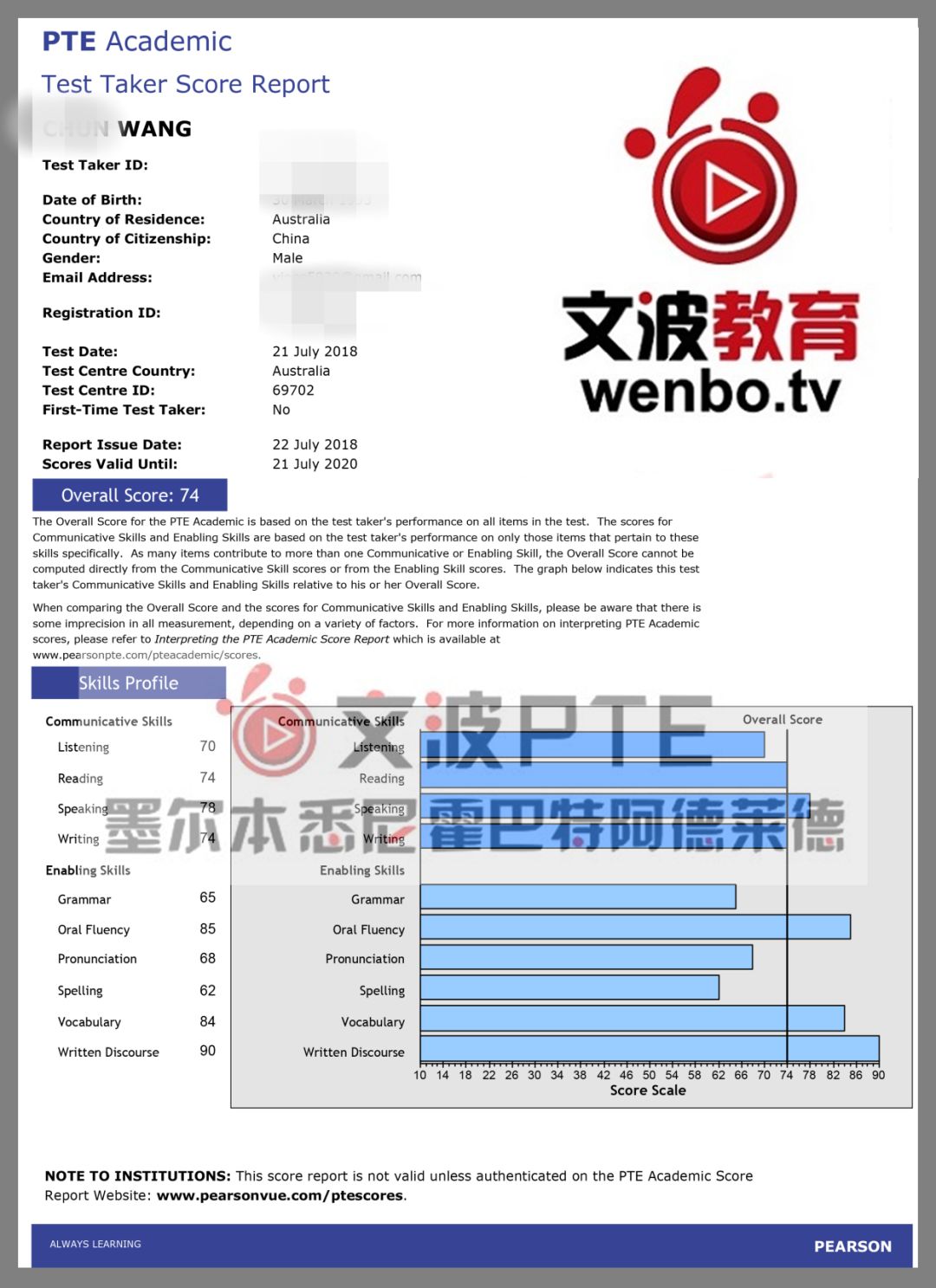 恭喜墨尔本悉尼霍巴特阿德莱德文波PTE学员Wang同学获得听力70,阅读74,口语78,写作74,总分74的好成绩!也是7月文波PTE第86位通过四个七四个八的学员