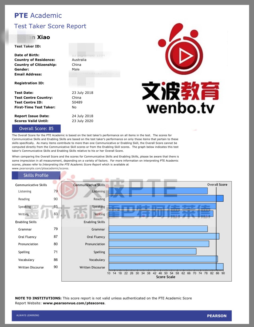恭喜墨尔本悉尼霍巴特阿德莱德文波PTE学员Xiao同学获得听力79,阅读90,口语85,写作83,总分85的好成绩!也是7月文波PTE第82位通过四个七四个八的学员