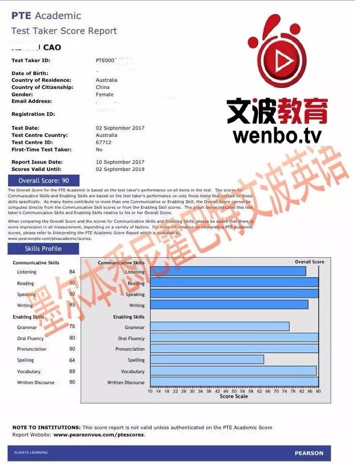恭喜墨尔本悉尼霍巴特文波PTE学员Echo获得听力82,阅读90,口语90,写作90,总分89分的好成绩!也是九月文波PTE第31位通过四个七四个八的学员.