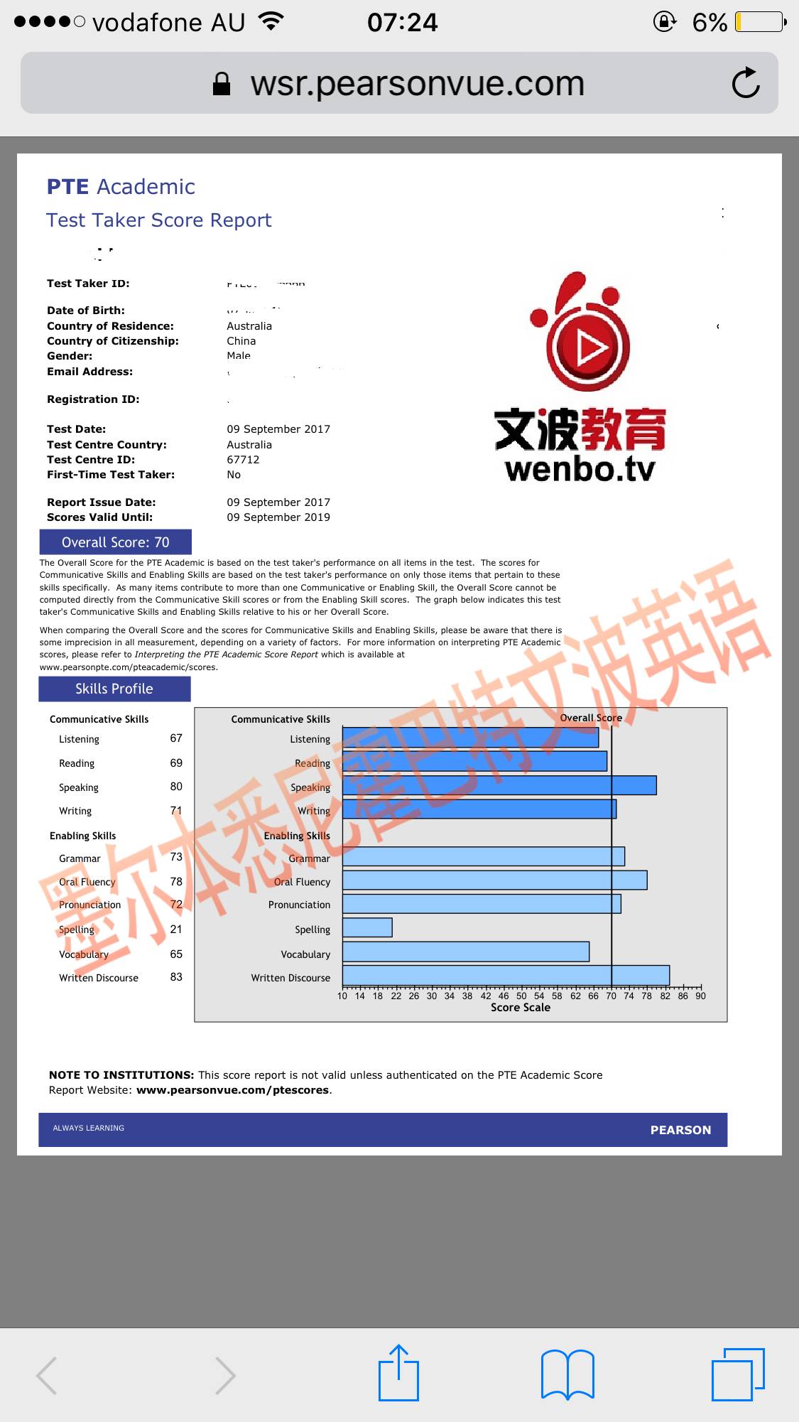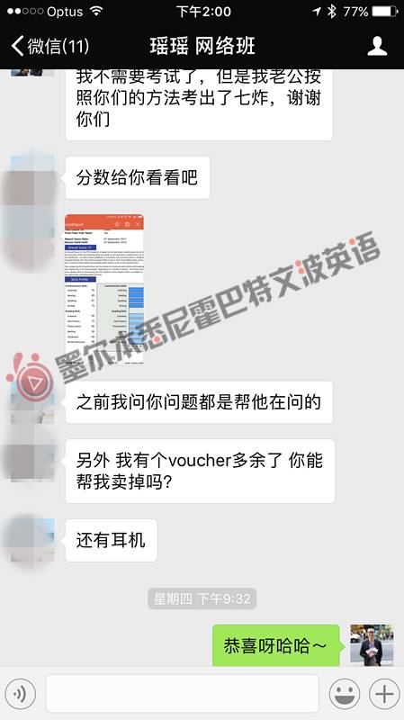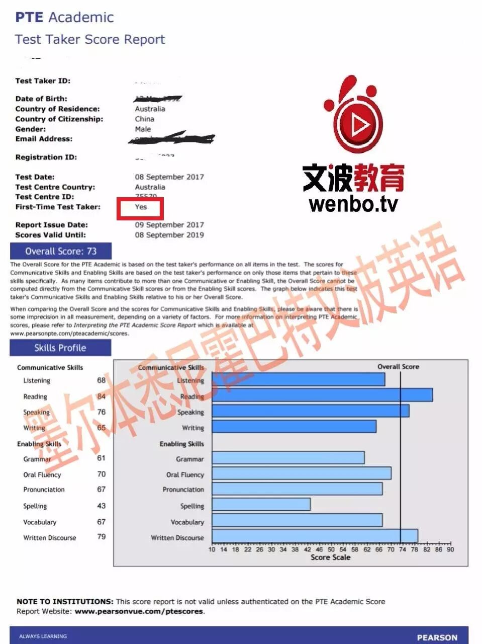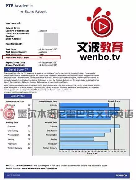 恭喜墨尔本悉尼霍巴特文波PTE学员Yao获得听力70,阅读83,口语81,写作73,总分77分的好成绩!也是九月文波PTE第35位通过四个七四个八的学员.