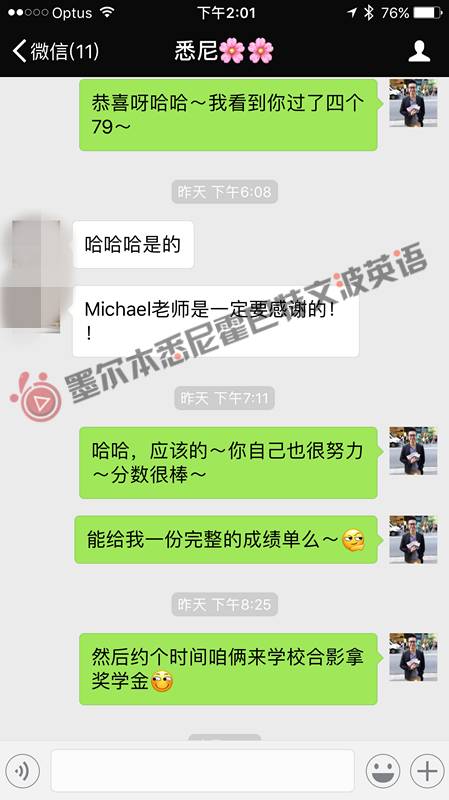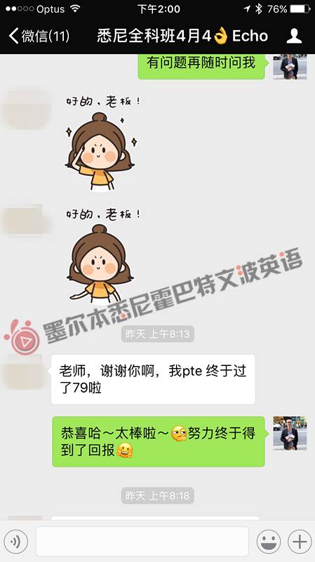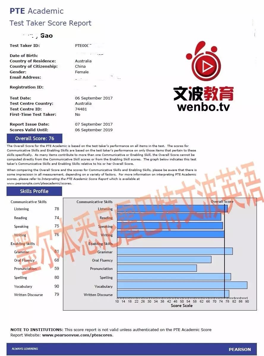 恭喜墨尔本悉尼霍巴特文波PTE学员Gao获得听力78,阅读74,口语75,写作76,总分76分的好成绩!也是九月文波PTE第36位通过四个七四个八的学员.